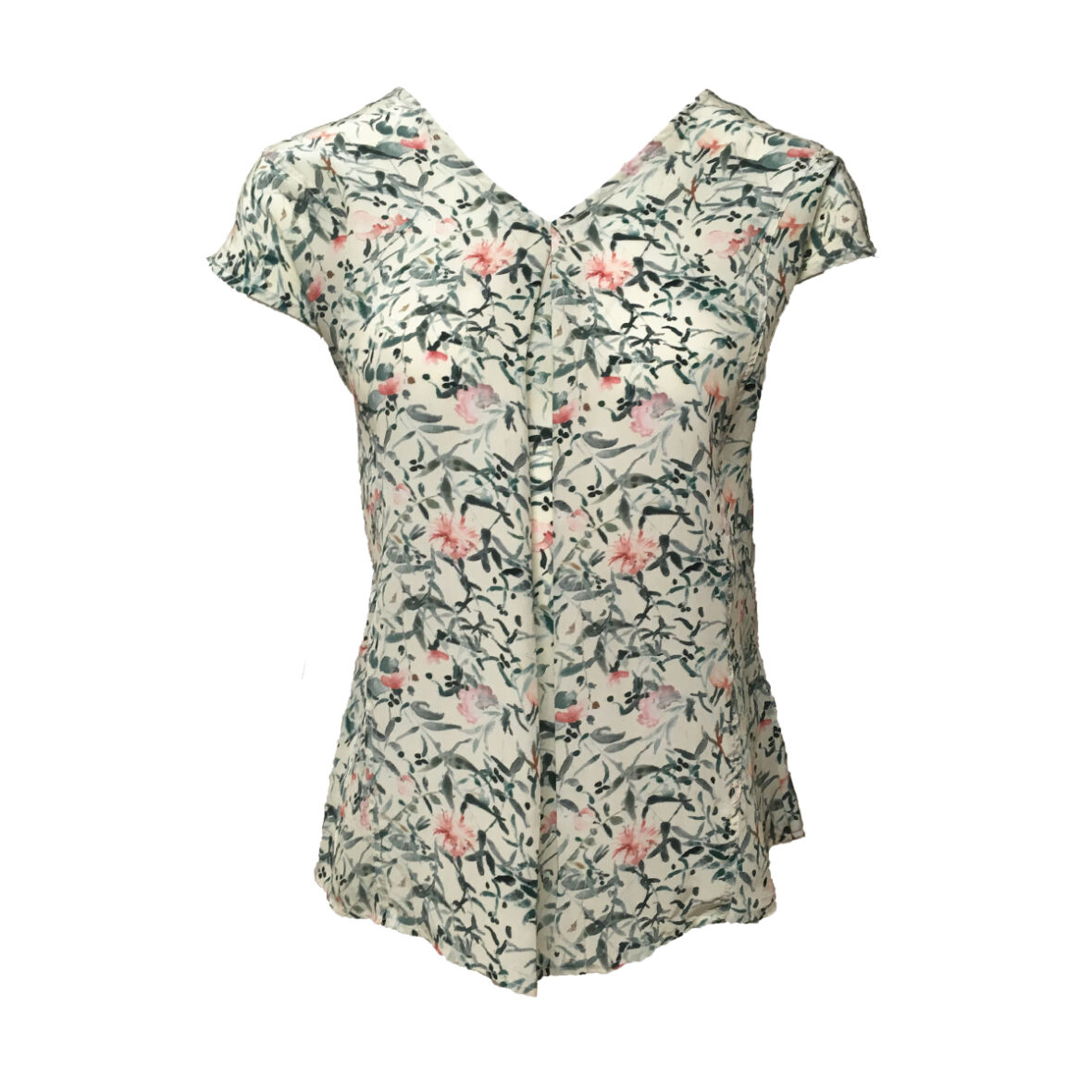 Blusen har en feminin pasform med v-udskæring og en plissé ned langs fronten.