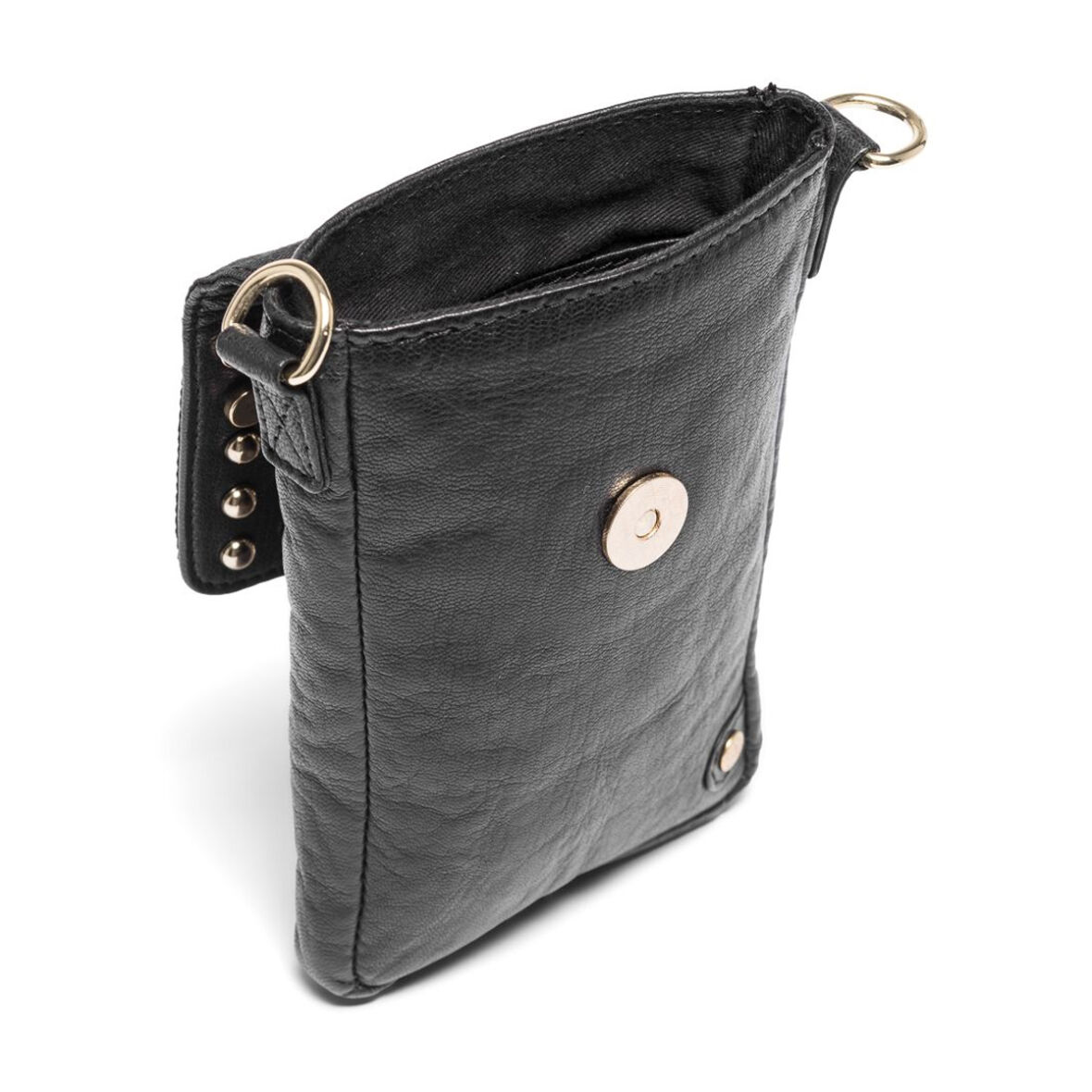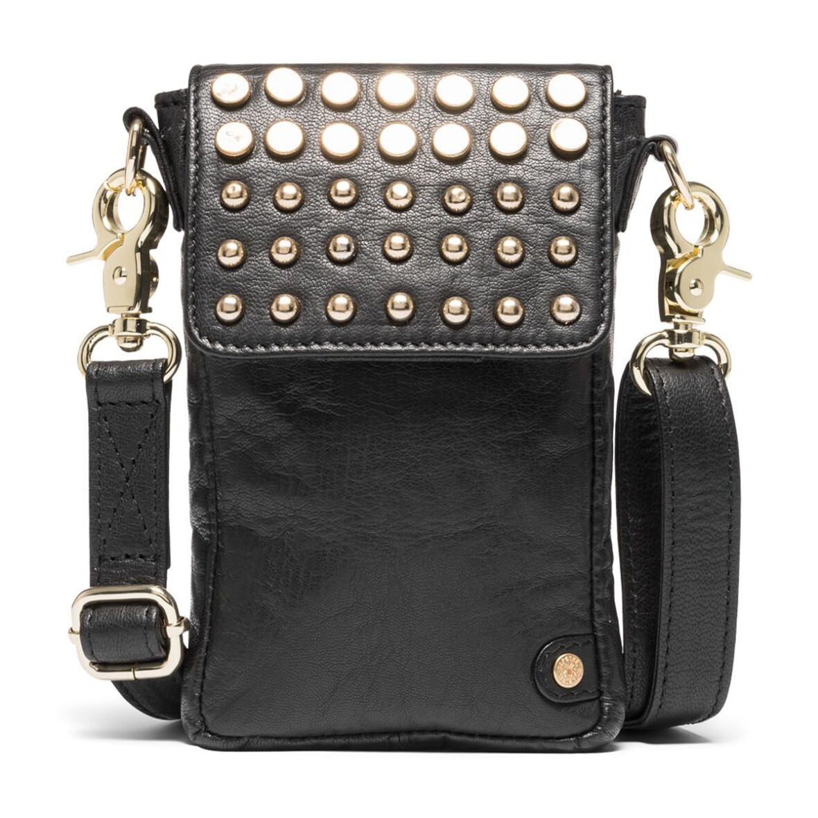Lækker, lille mobiltaske fra Depeche i en klassisk sort med guld nitter.