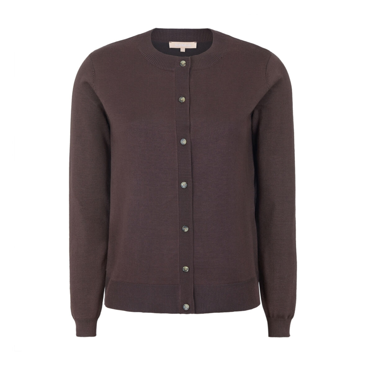 Cardiganen er gennemknappet, rund halsudskæring og lange ærmer.