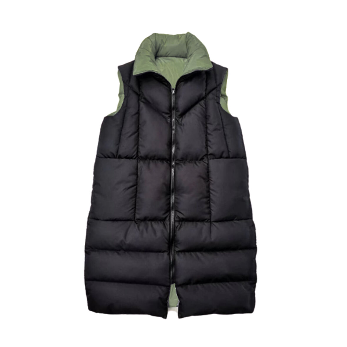Vesten lukkes ved en lynlås, og har en høj krave.