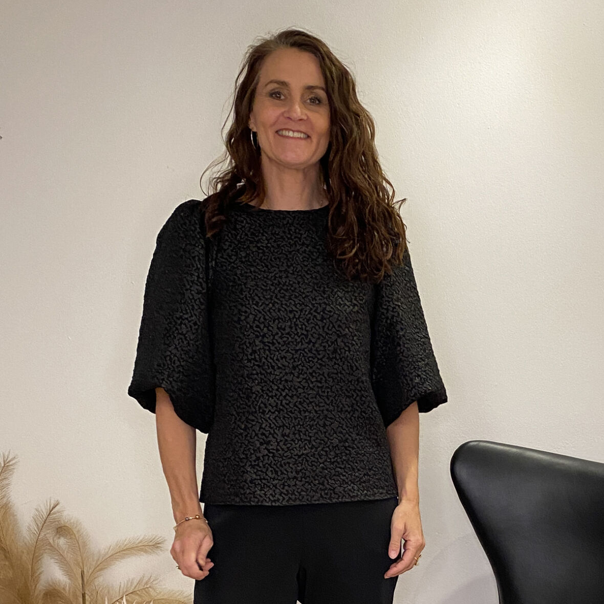 Blusen har korte og meget elegante ballonærmer og lukkes med knap i nakken.