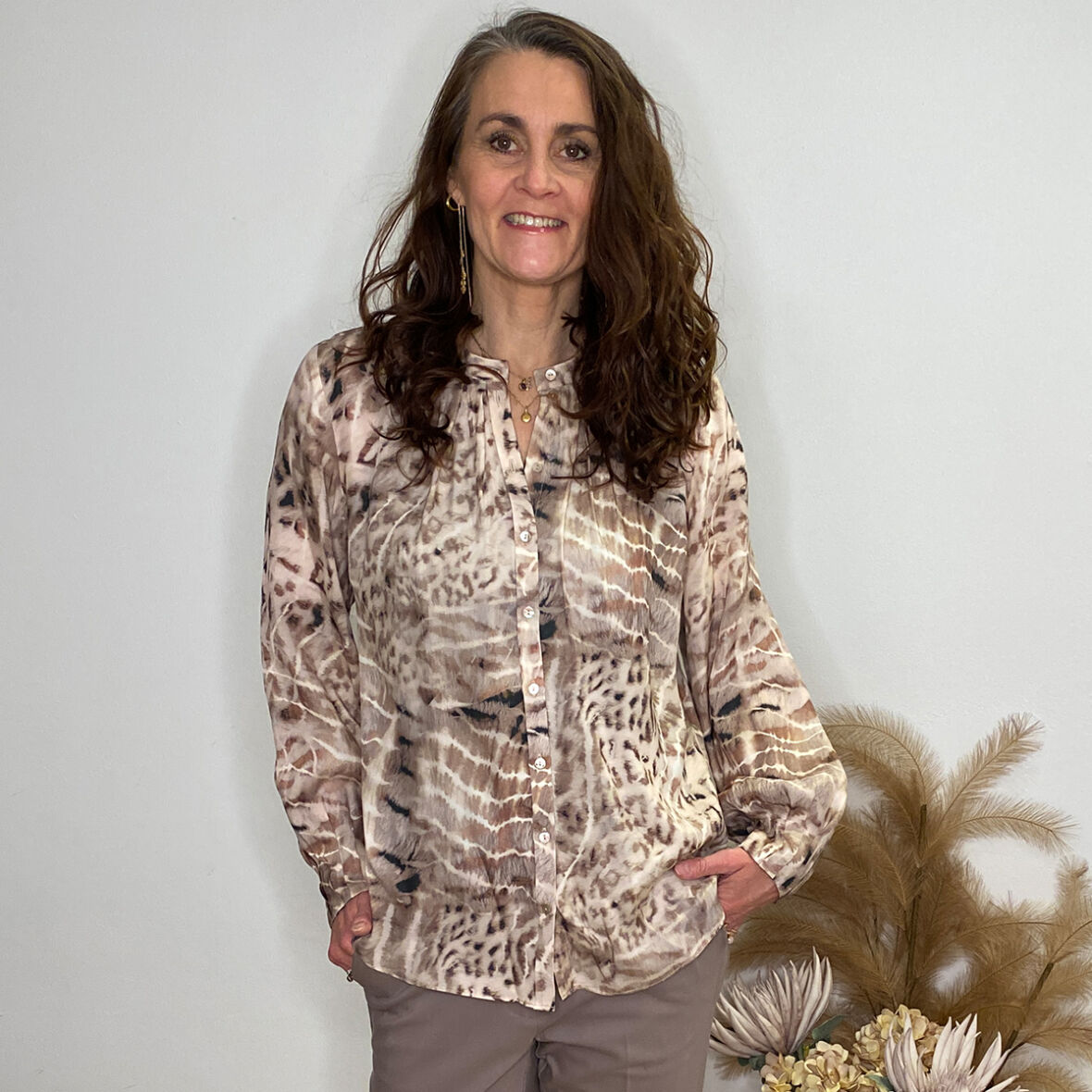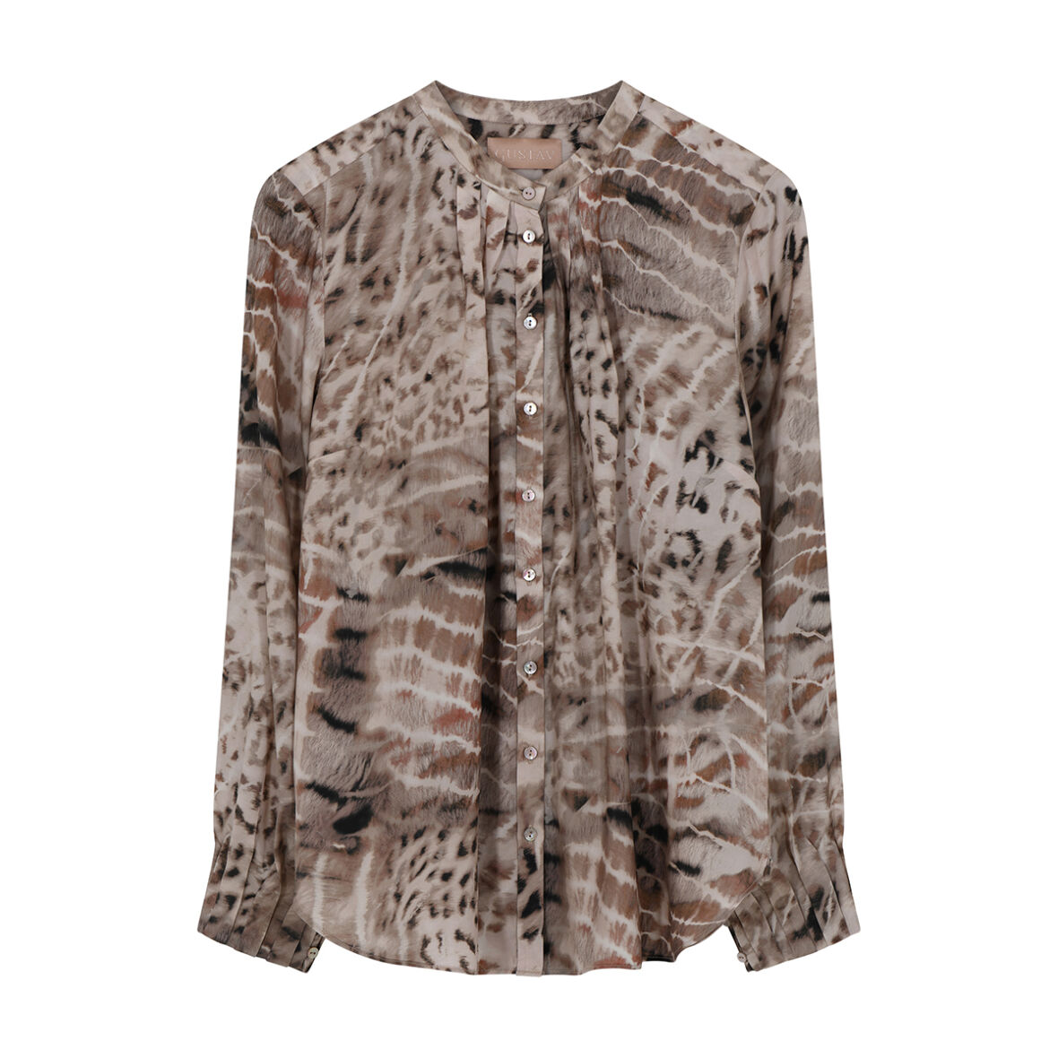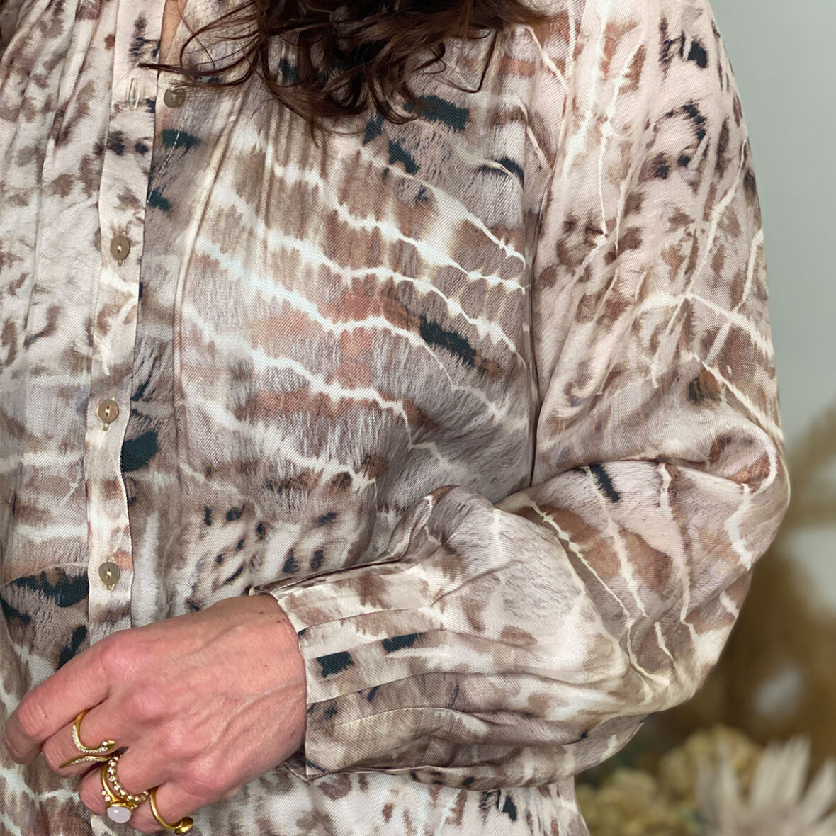 Skjorten er gennemknappet og har smukke lægdetaljer ved håndleddet.