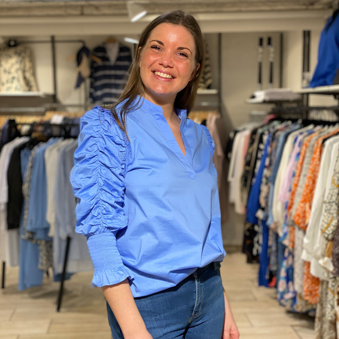 Smuk bluse fra Gossia med pufærmer og rynkeeffekt ned af siden på ærmet.