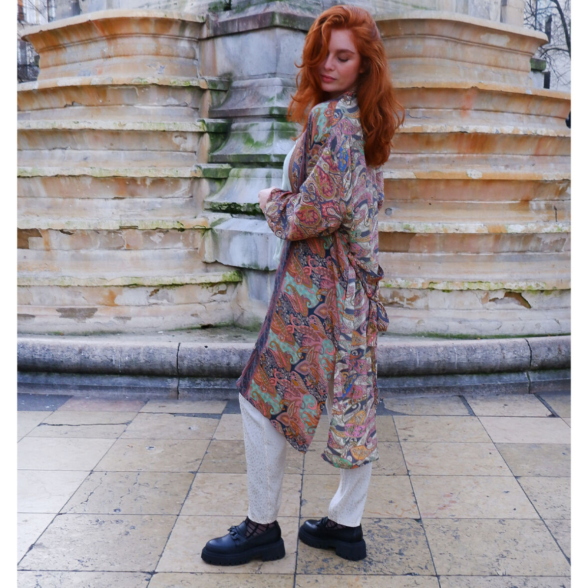 Kimonoen har lange ærmer med elastikkant ved håndleddet, og lille slids i hver side af bunden.