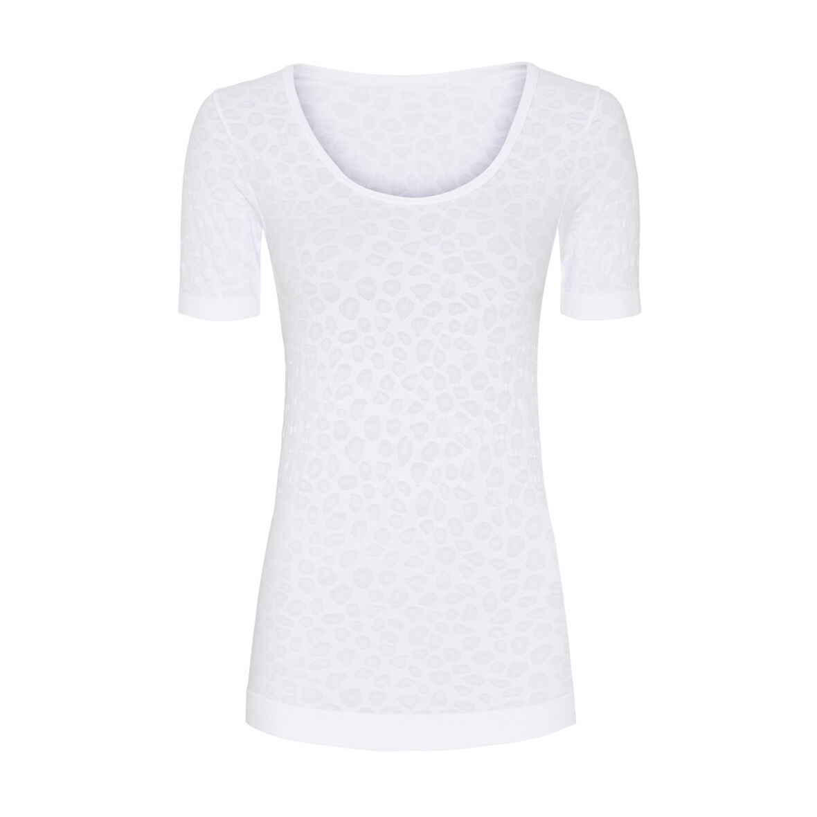 Den er strækbar, er med rund halsudskæring, og har leopard print vævet i stoffet.