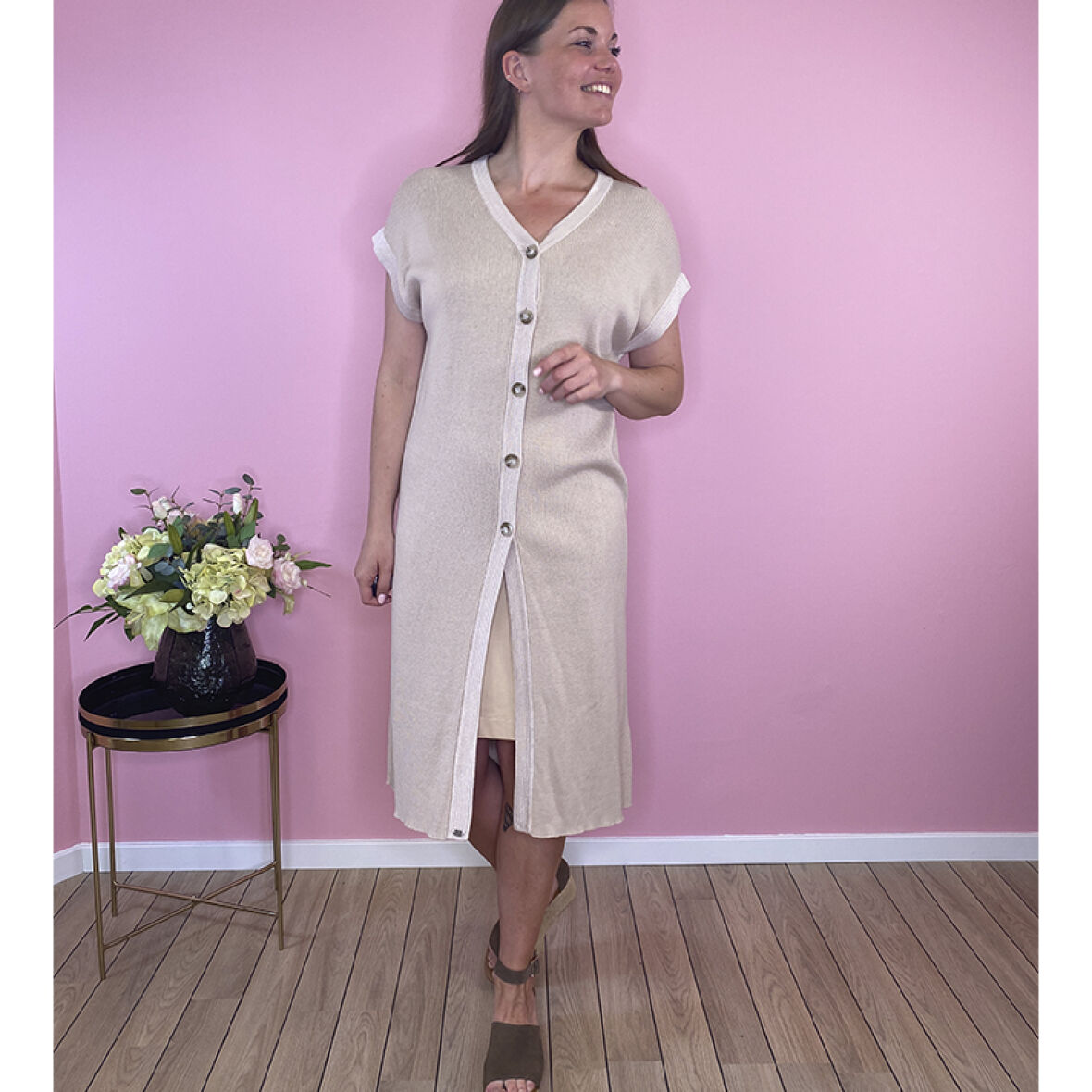 Lang strik vest fra Gustav, vesten er gennemknappet og med bred rib detaljer ved ærmer og hals.