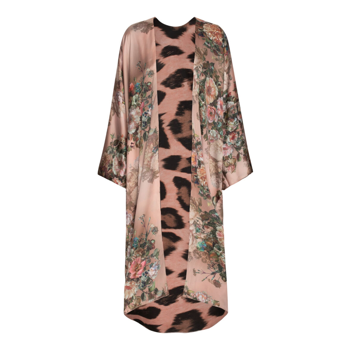 Kimonoen er åbenstående og er med leopardprint på den ene side og blomster-print på den anden.