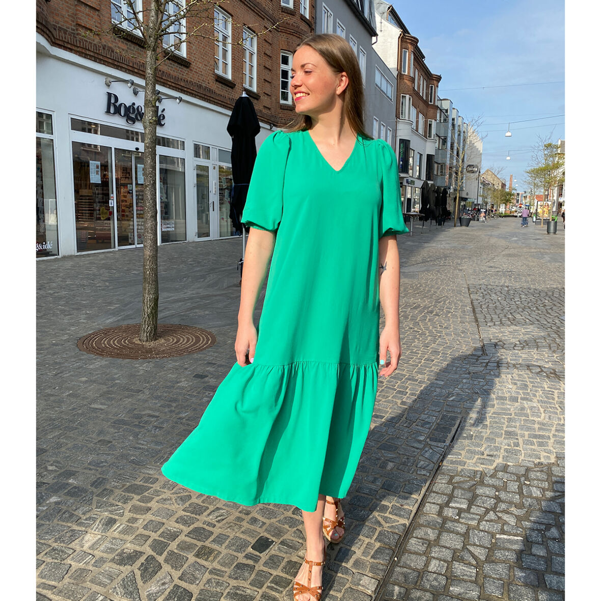 Kjolen har lange t-shirt ærmer som er elegant afsluttet med elasik og har v hals.
