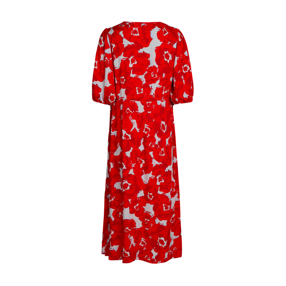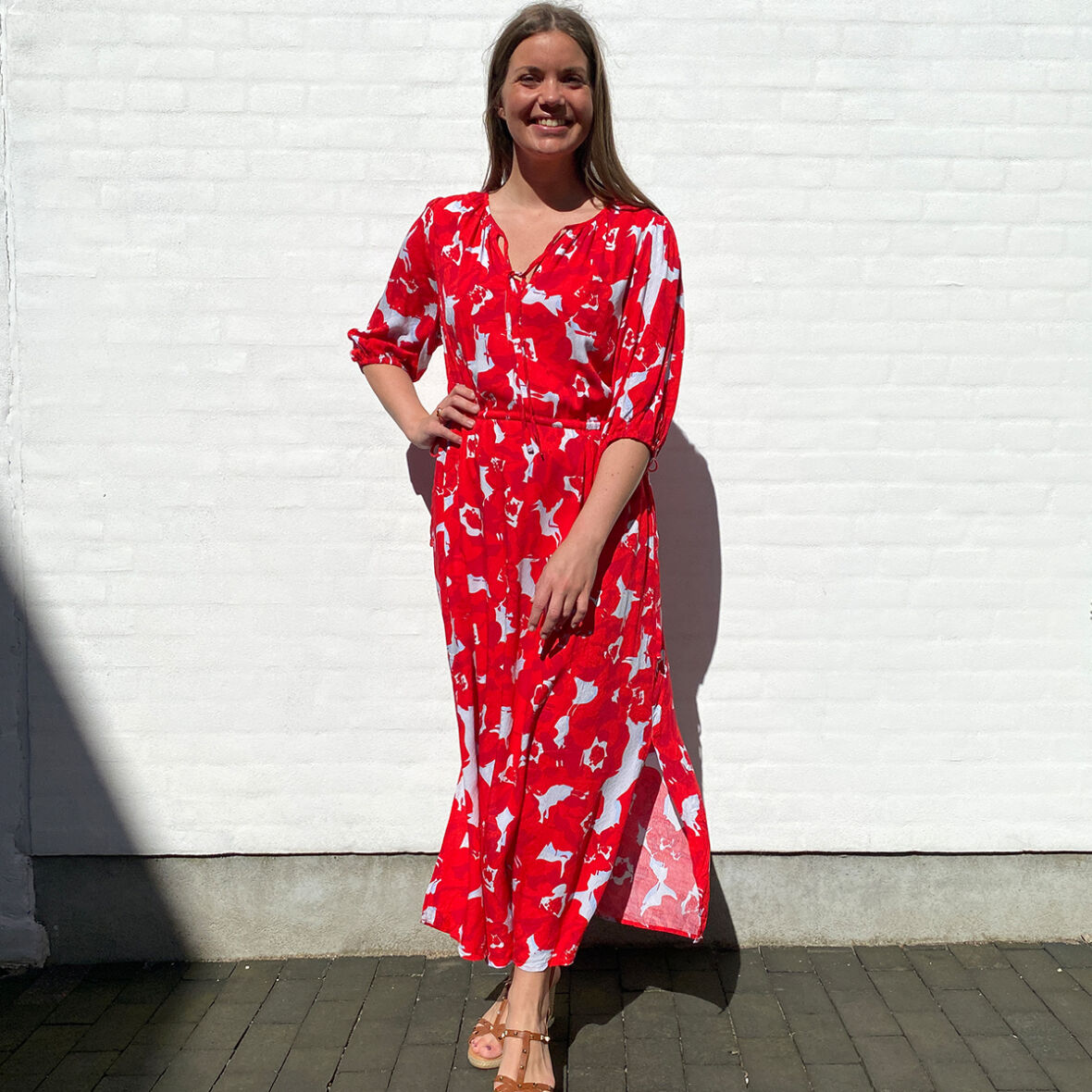 Kjolen har kort ærme mede ballon-effekt og rund halsudskæring med V-udsnit.