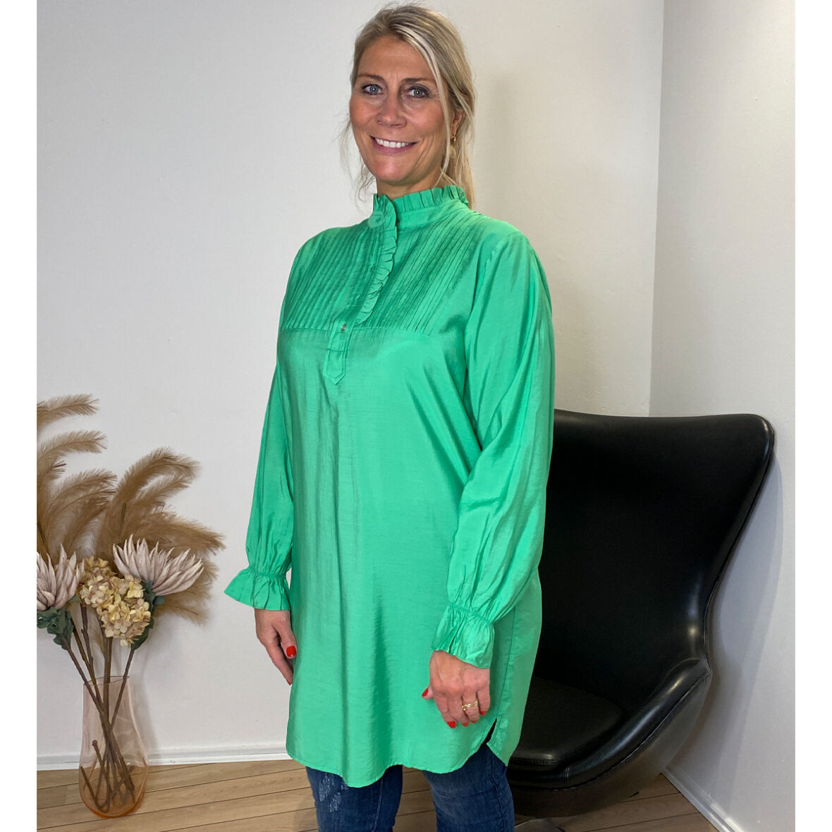 Kjolen har fine syede pintuck over brystet, stolpeåbning og en kinakrave.