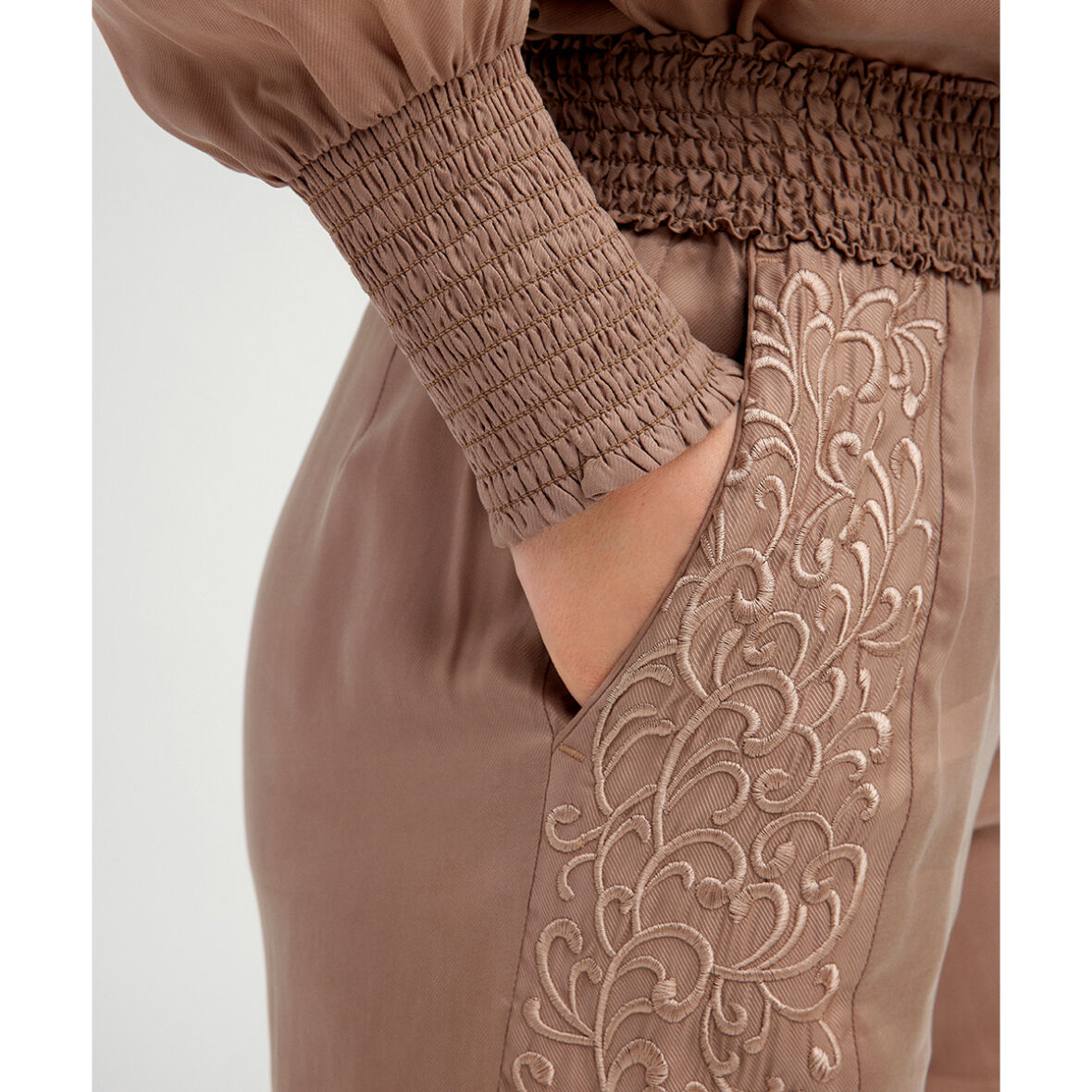 Buksen har en bred smock kant i taljen og lige ben.