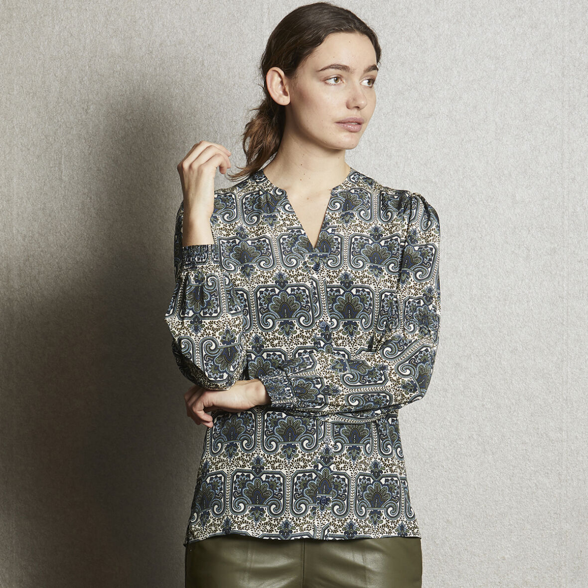 Smuk skjorte fra PBO i et flot print med lange ærmer med smock ved albuen og håndleddet.
