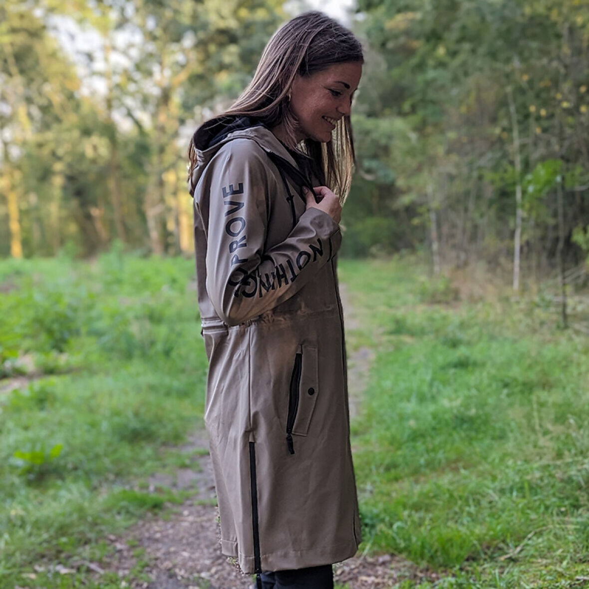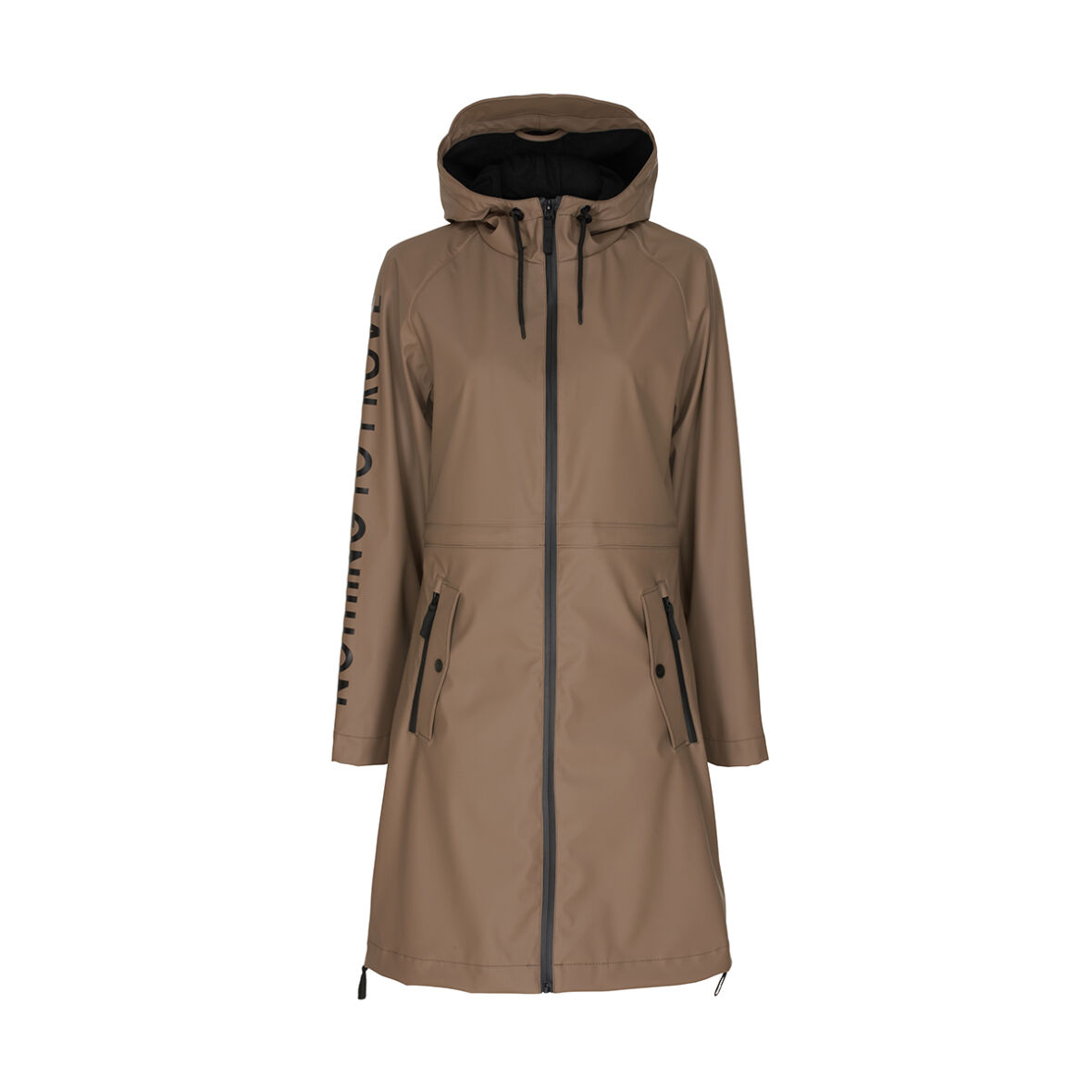Regnfrakken har snøre i livet og i hætten, og stiklommer i siderne.