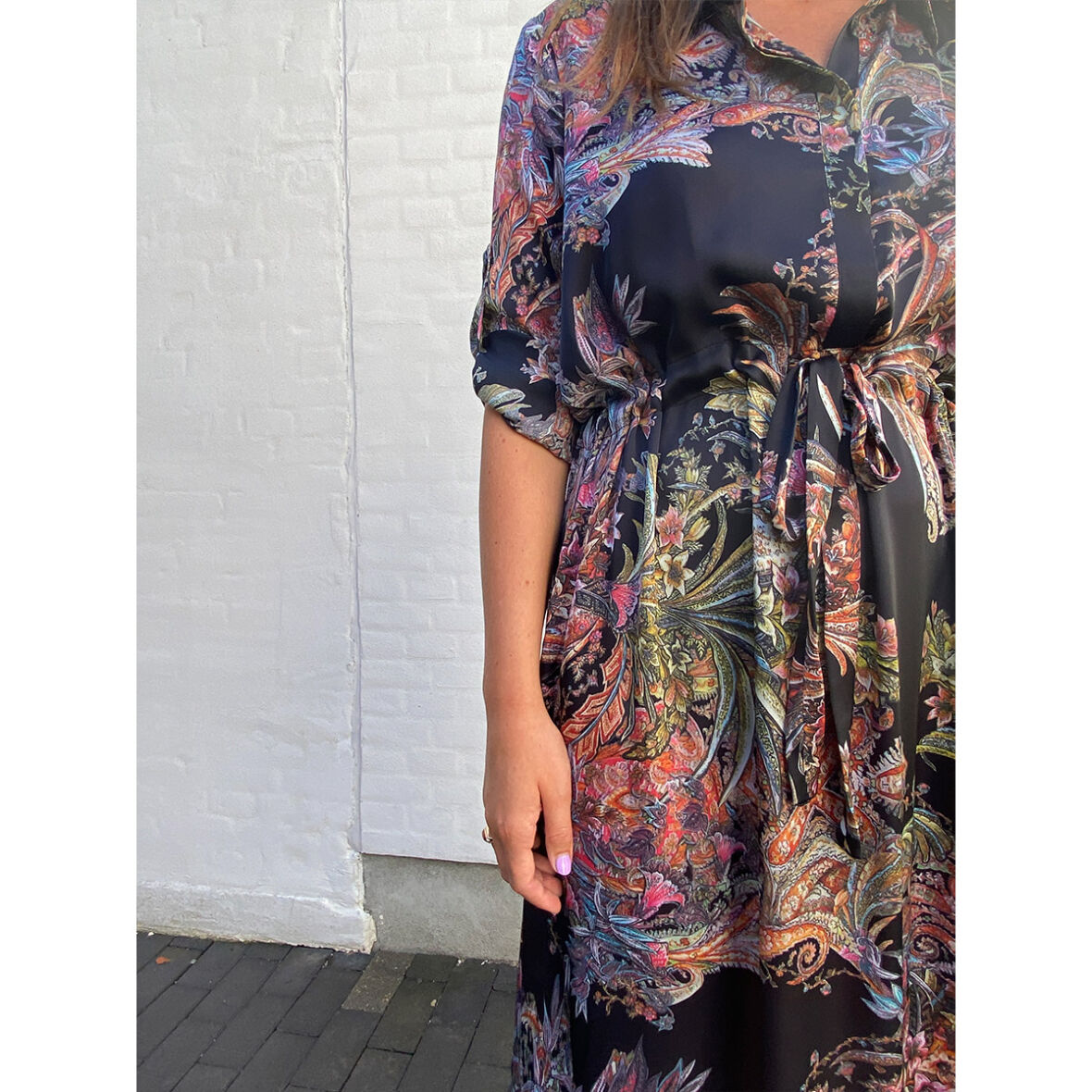 Kjolen har knapper i overdelen og har bindebånd til at fremhæve taljen.