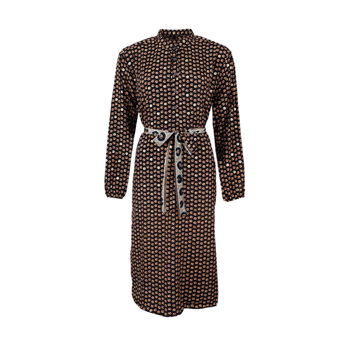 Flot kjole fra Black Colour i et smukt print med bindebånd til at fremhæve taljen.