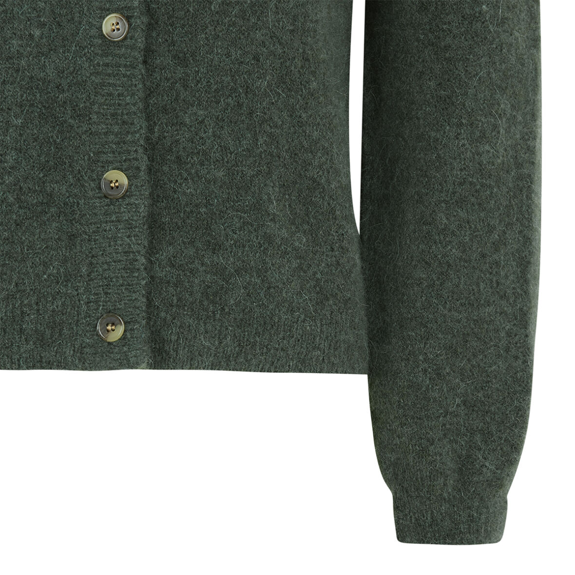 Cardiganen lukkes med brun knapper.
