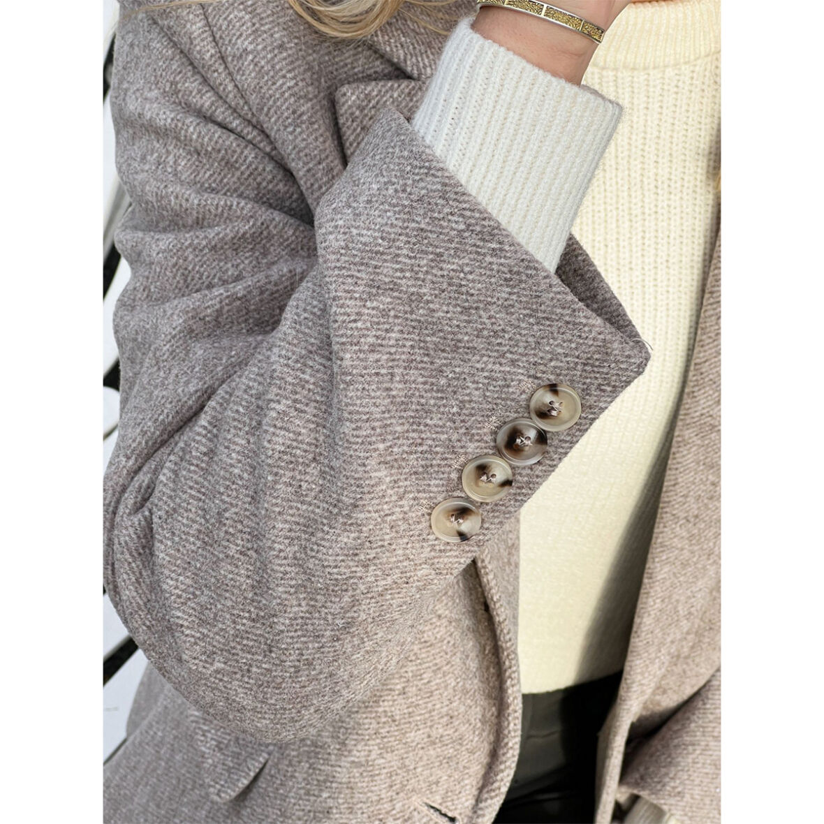 Blazeren har lange ærmer, revers og lukkes med en smuk naturknap.