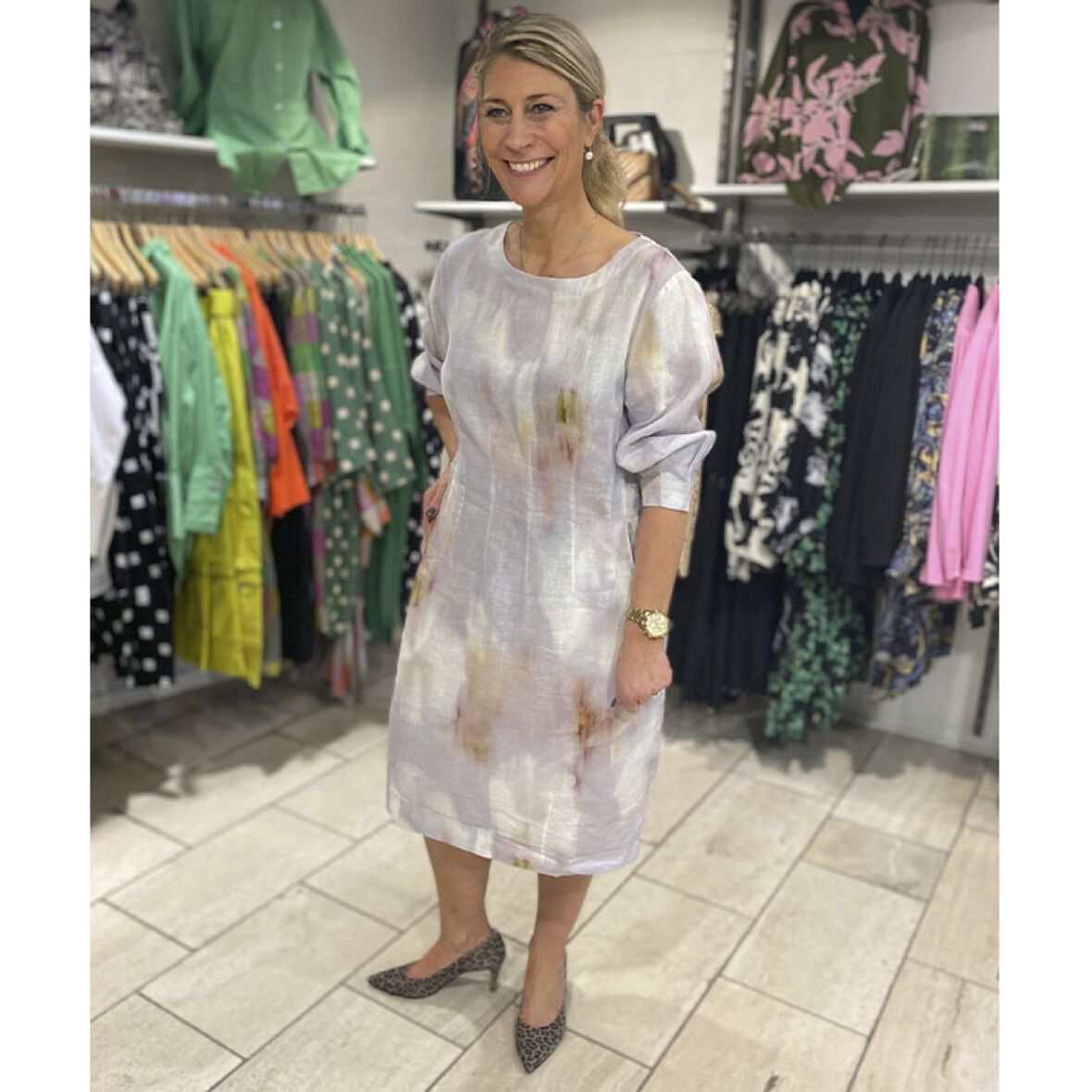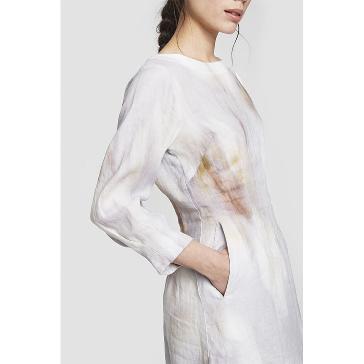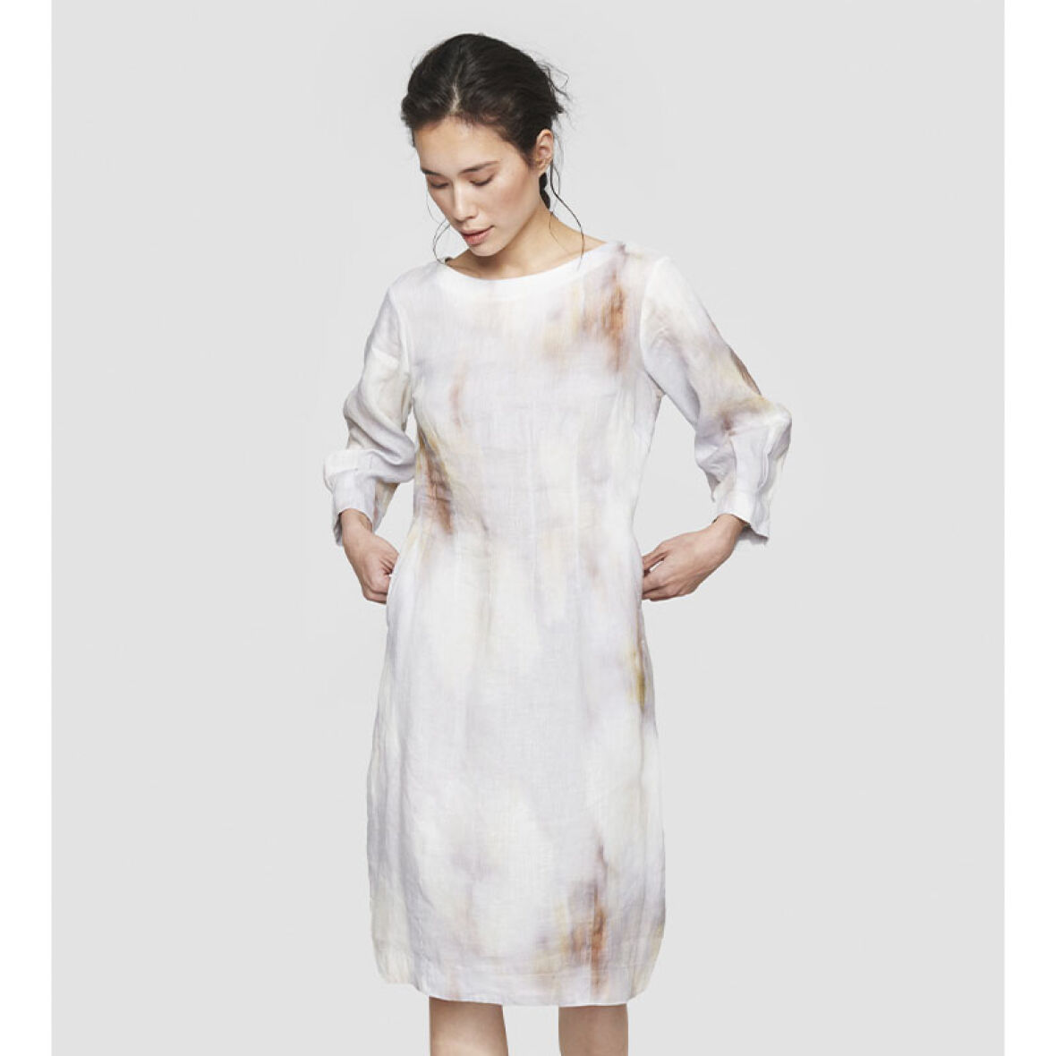 Kjolen har en rund hals og 3/4 ærmer og går derudover ind ved taljen.