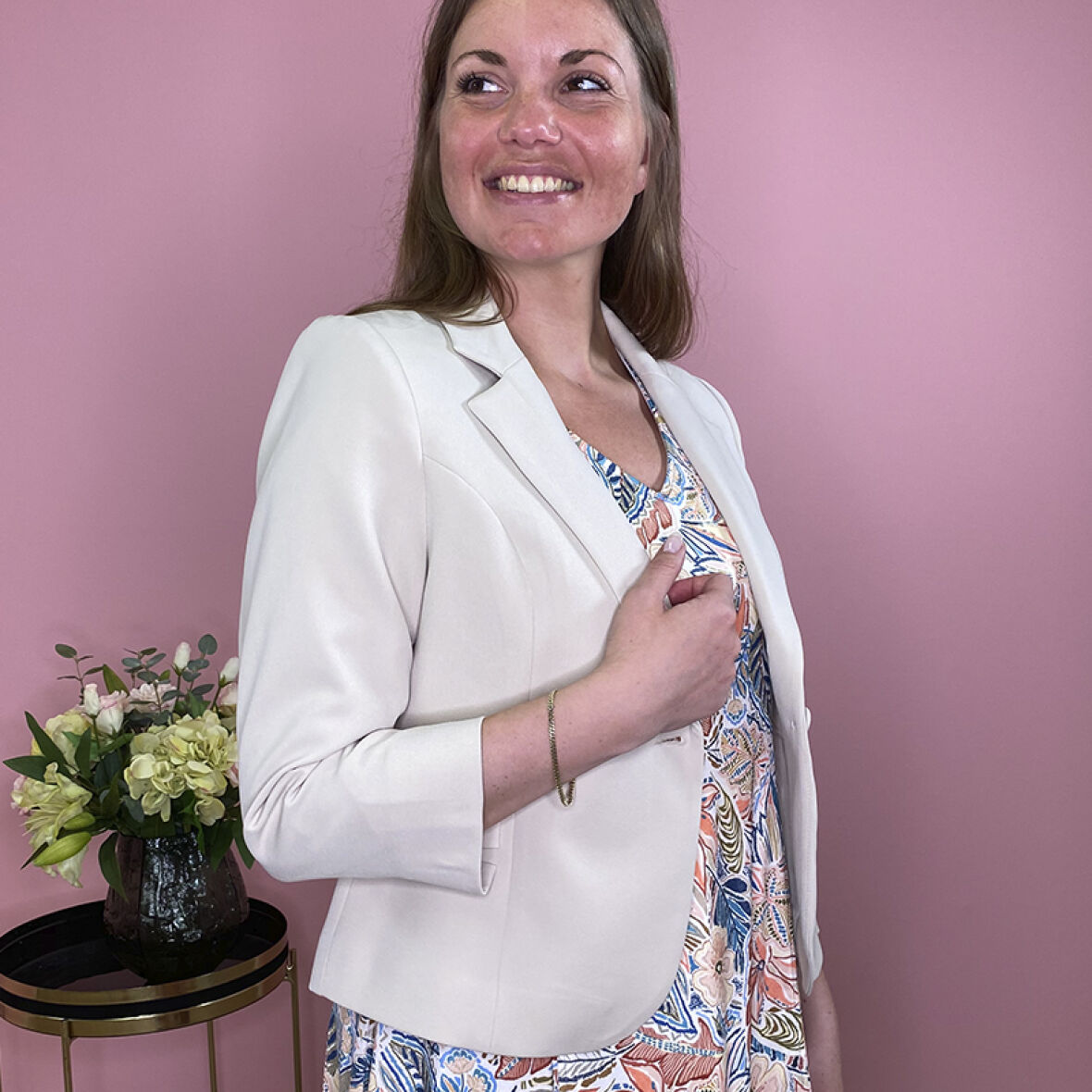 Blazeren har klassiske snit og detaljer samt trekvart ærmer med en lille slids.