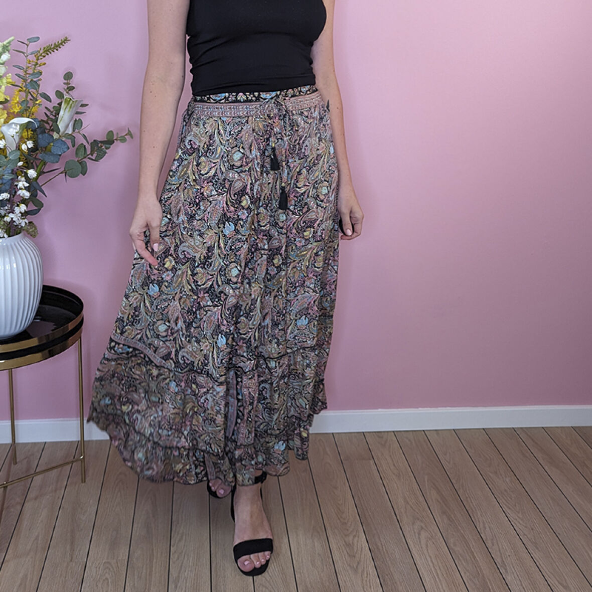 Nederdelen har snøre i taljen og elastikstykke i ryggen,