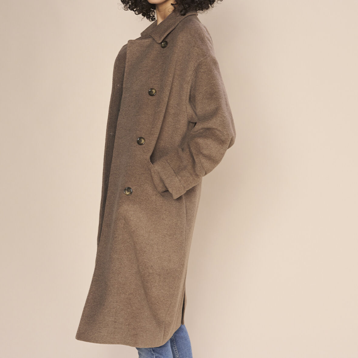 Frakken lukkes med dobbeltradet knapper.