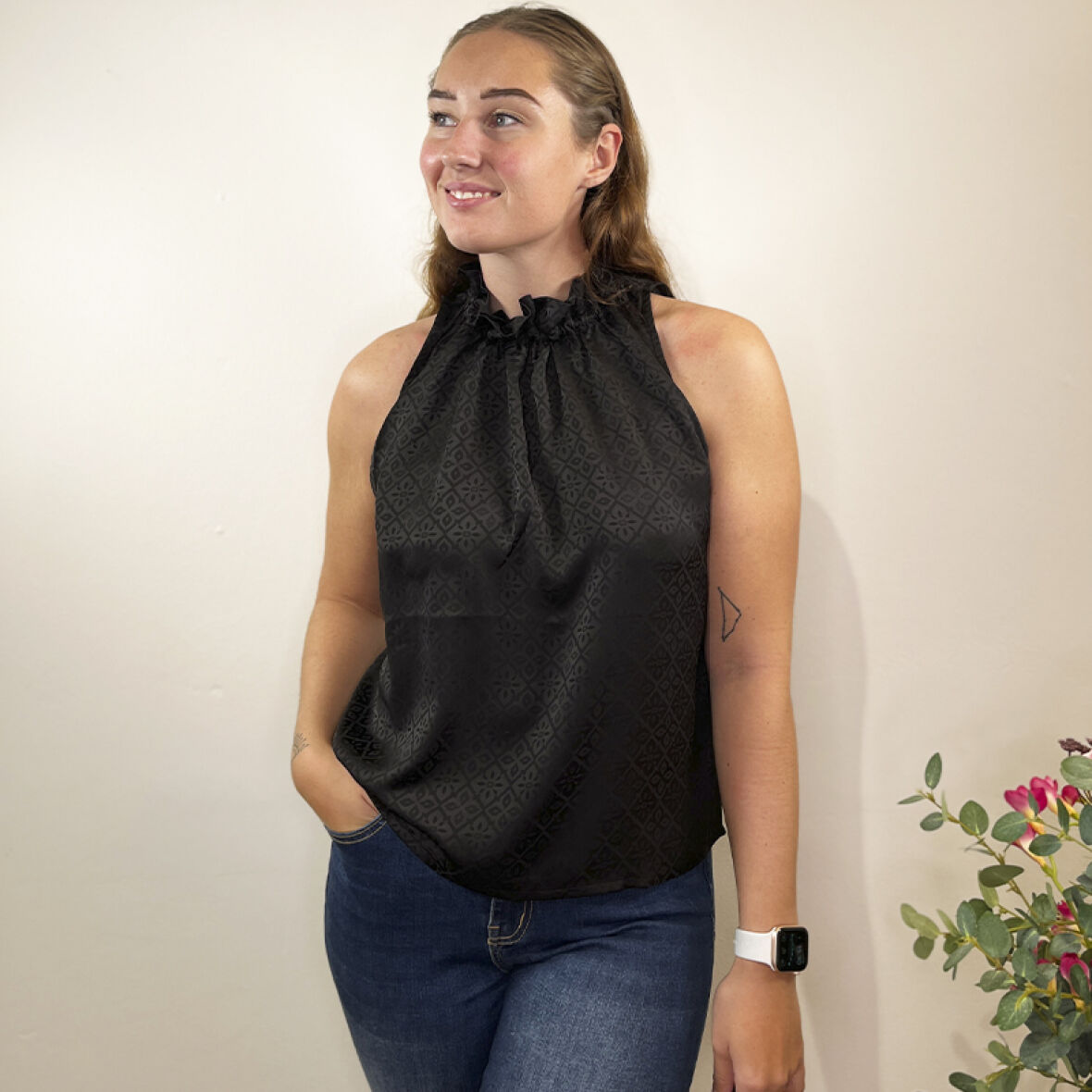 Toppen lukkes med bindebånd i nakken og er uden ærmer.