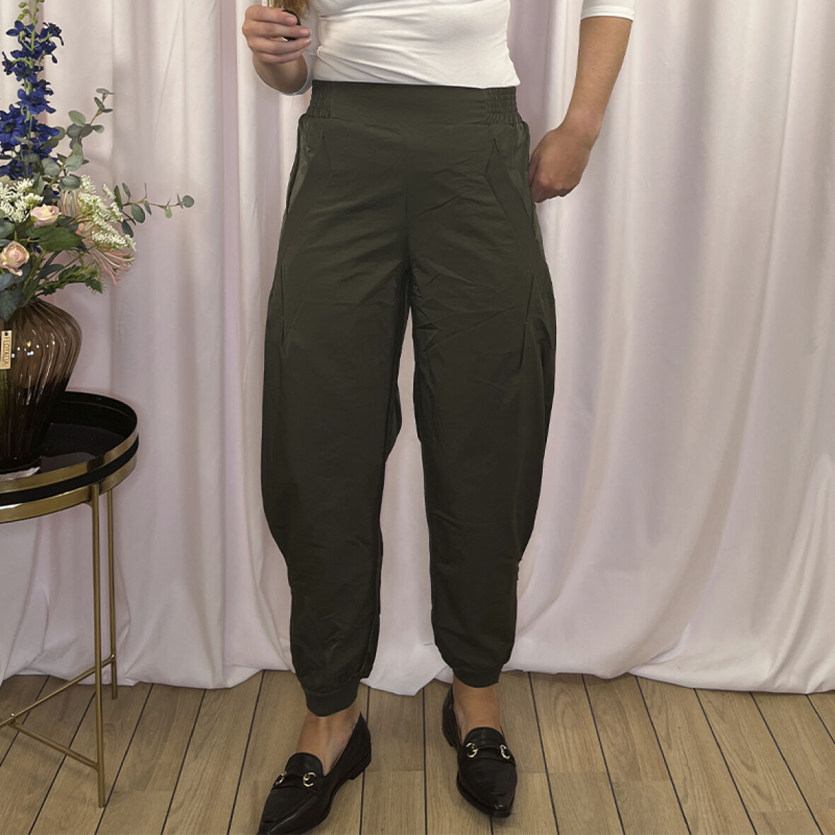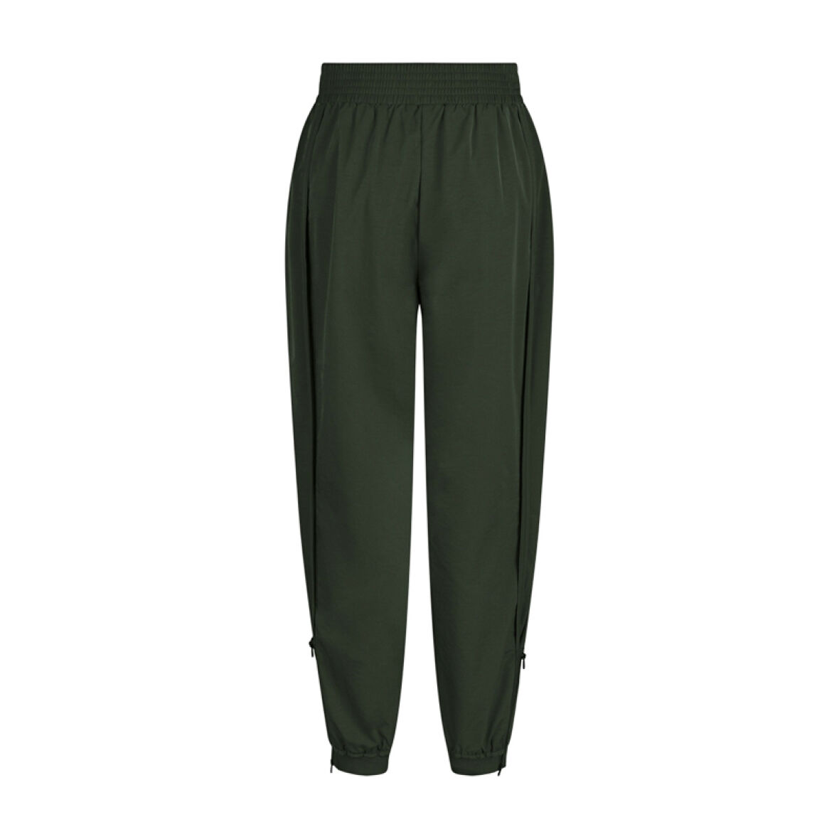 Buksen har elastik i taljen og lynlås og elastik ved anklerne.