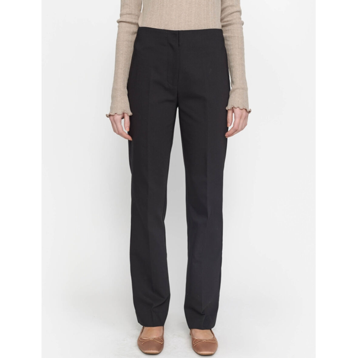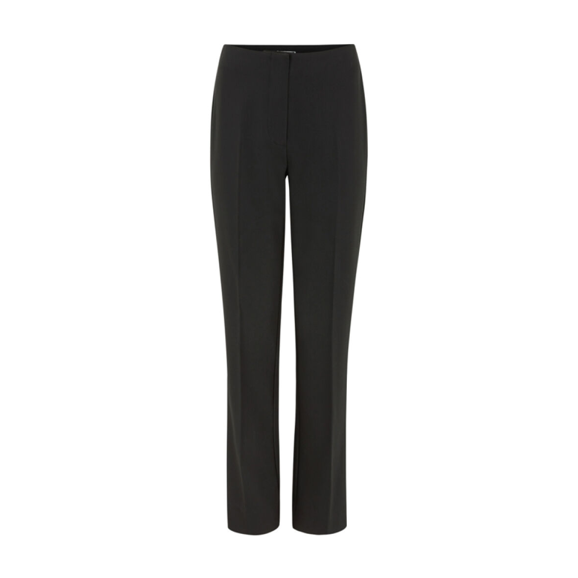 Buksen har skjult elastik i taljen og lukkes med skjulte hægter samt lynlås.