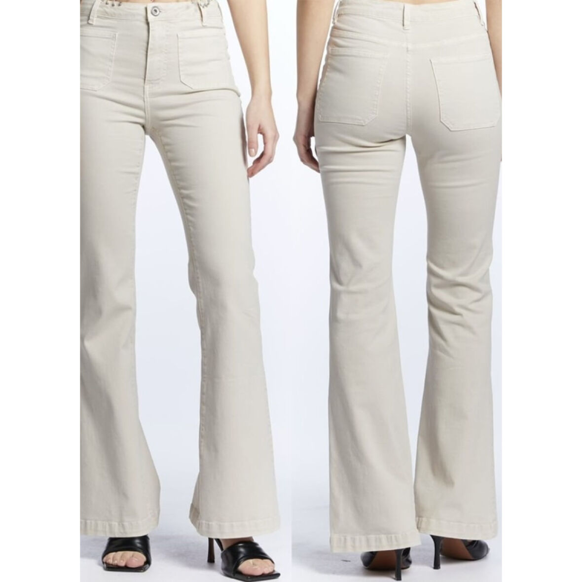 Bukserne er i en bootcut stil, hvor de sidder til i livet og ved lårene, og har vidde forneden.