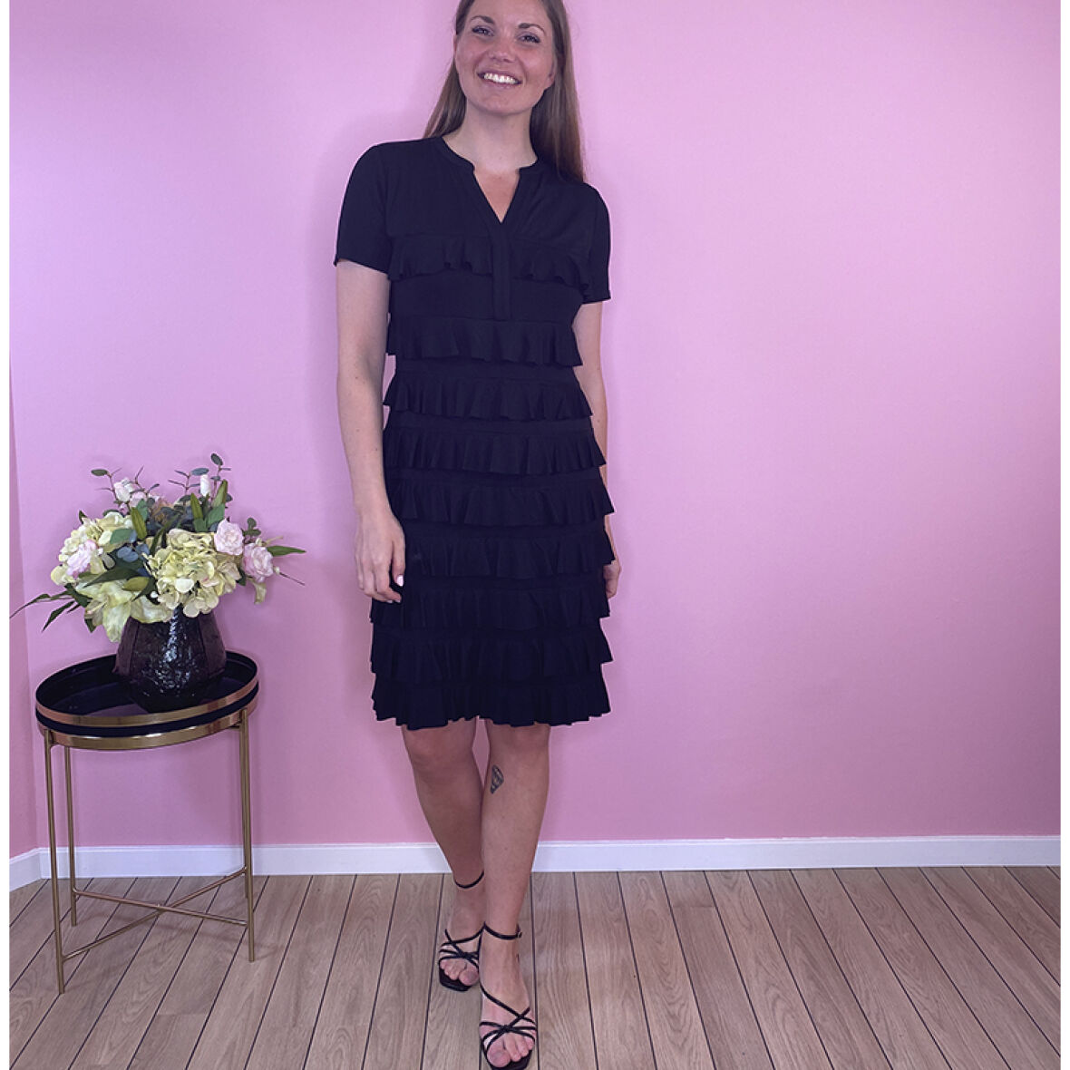 Smuk kjole fra PBO med flæsedetaljer ned langs kjolens bryst og skørt.