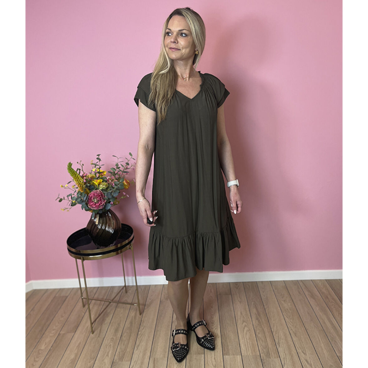 Kjolen har en flot feminin pasform med korte 2 lags vingeærmer og smock stikninger i halsen.