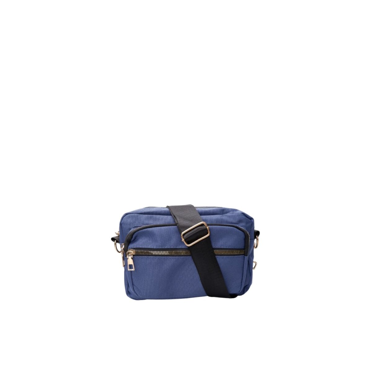 Skinnende crossover-taske i kanvas med udvendig lomme og indvendig lynlåslomme.