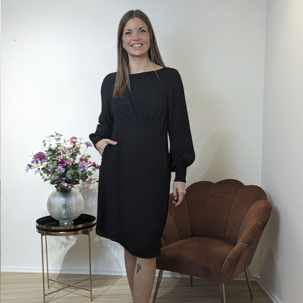 Kjolen har skjulte lommer og smock-detalje ved håndleddet.