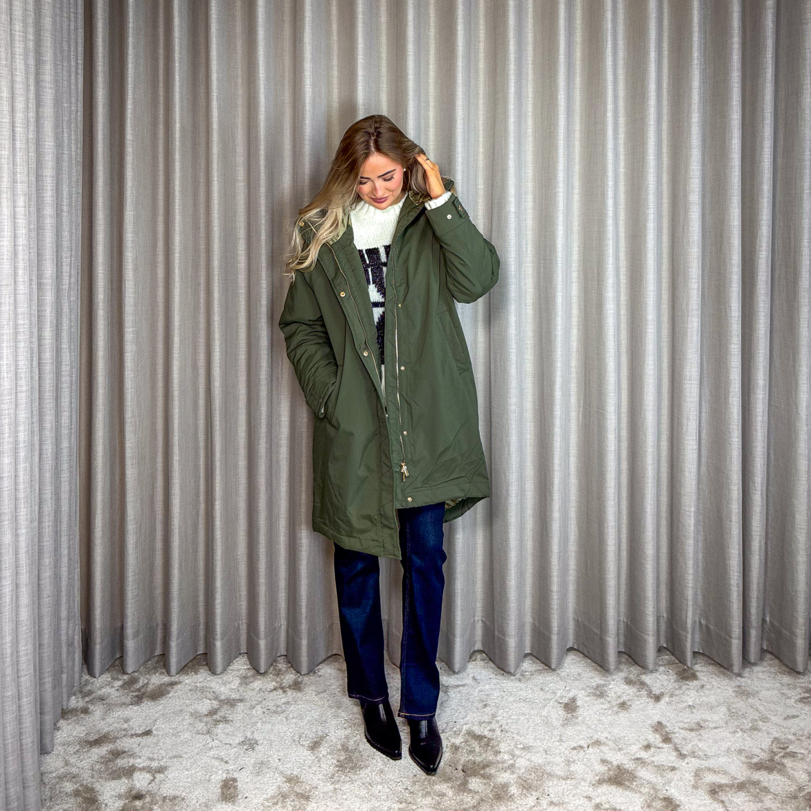 Denne oversize parkajakke er ideel til de kølige efterårsdage, hvor den quiltede foring sikrer, at du holder varmen.