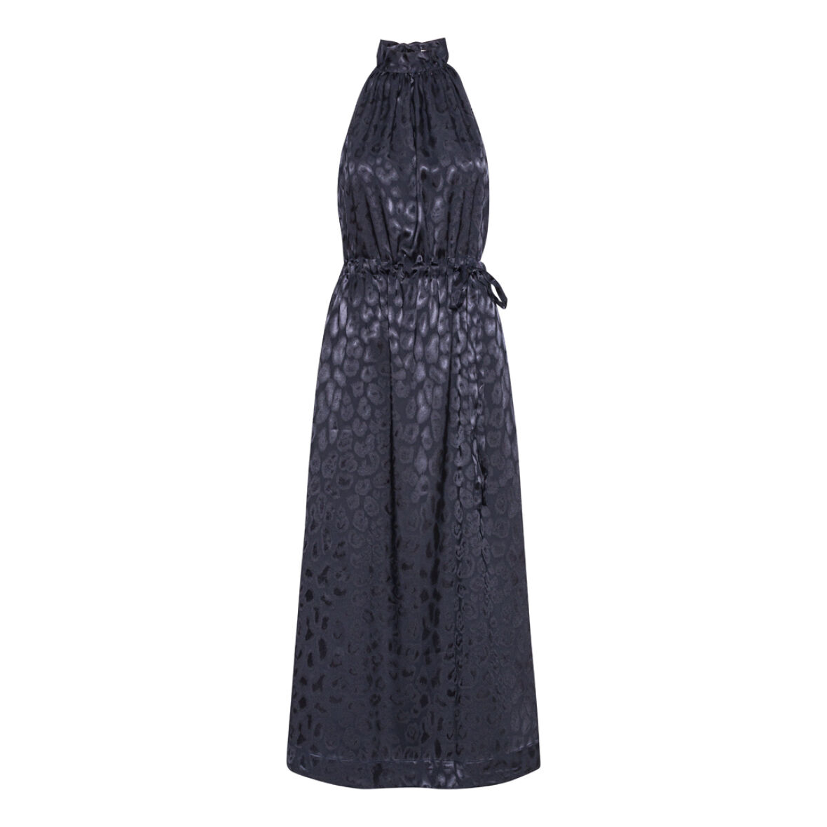 Den har et bindebånd i taljen og ved den høje halsudskæring.