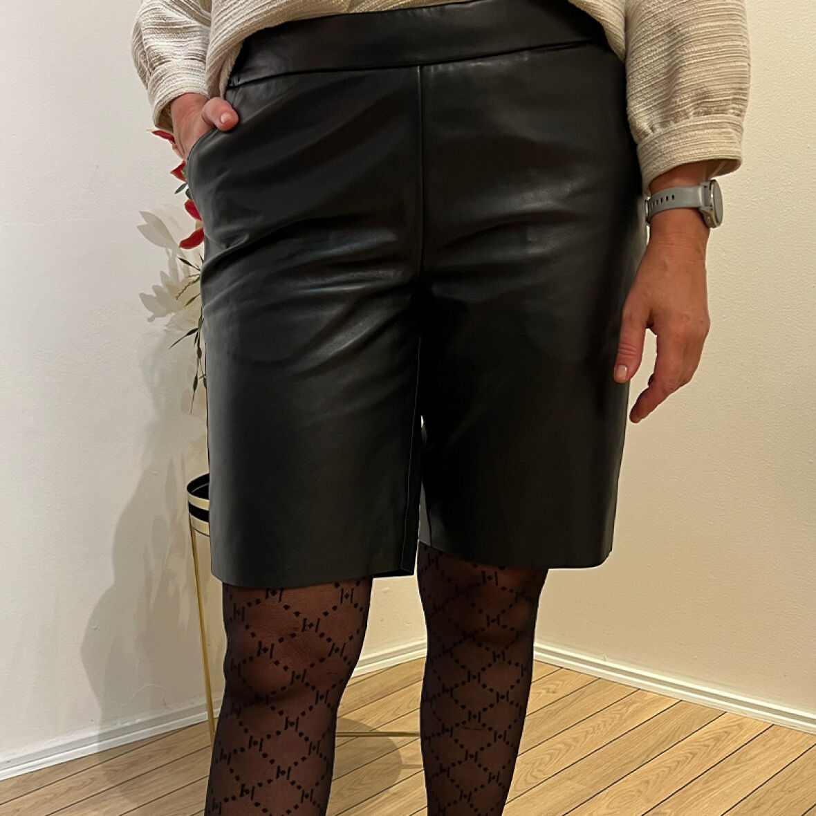 Disse lædershorts er designet med elastik i taljen, skrå sidelommer, saddleback-detalje og en rå kant forneden, der giver et edgy udtryk.