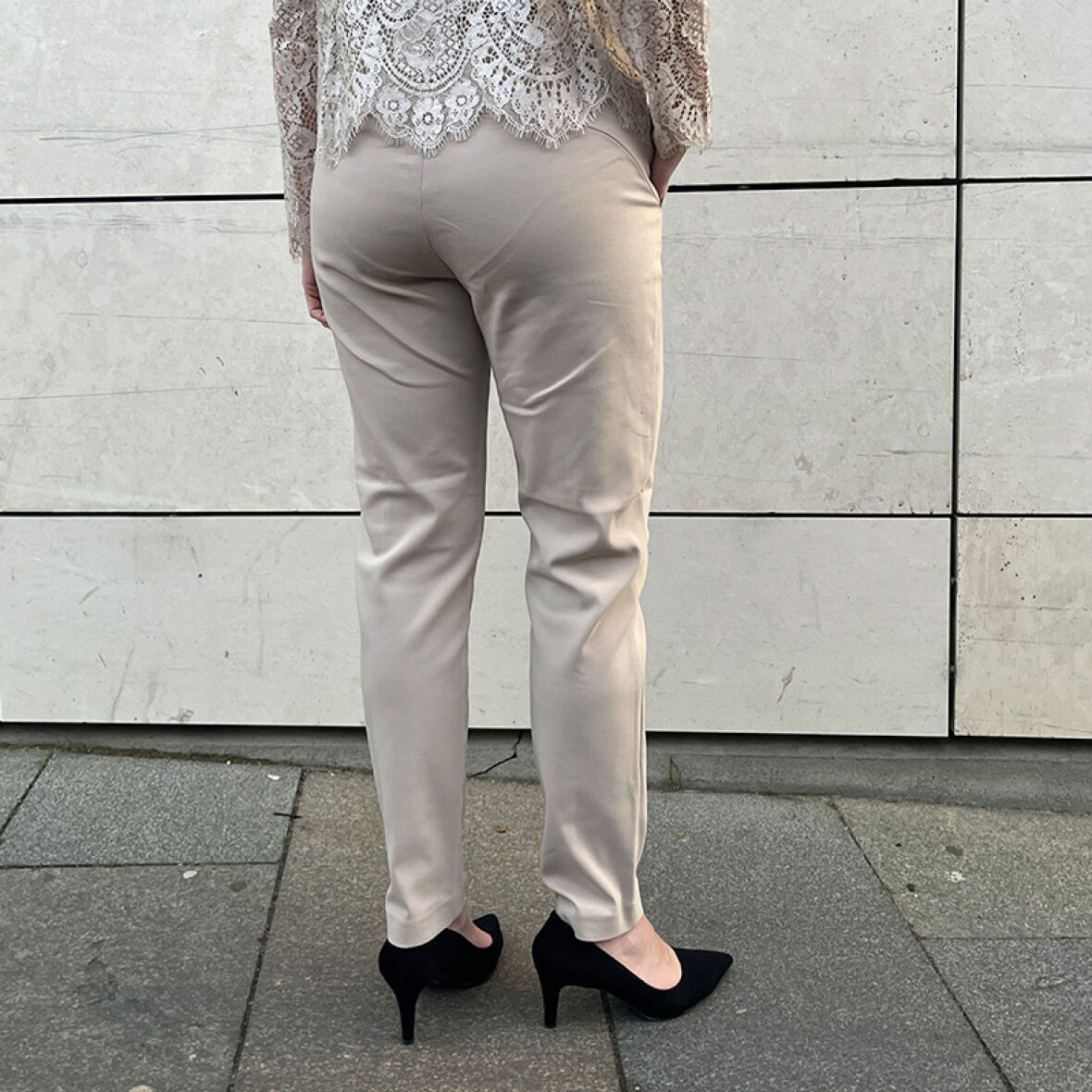 Bukserne har lommer i hver side og lukkes i den ene side med lynlås.