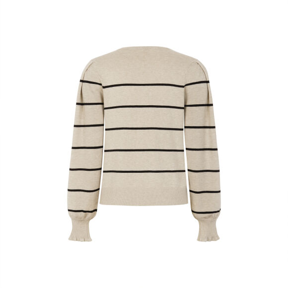En elegant striktrøje med brede ribkanter, rund halsudskæring og flotte læg ved skuldrene. Ærmerne afsluttes med fine, bølgede kanter, der giver et feminint touch.