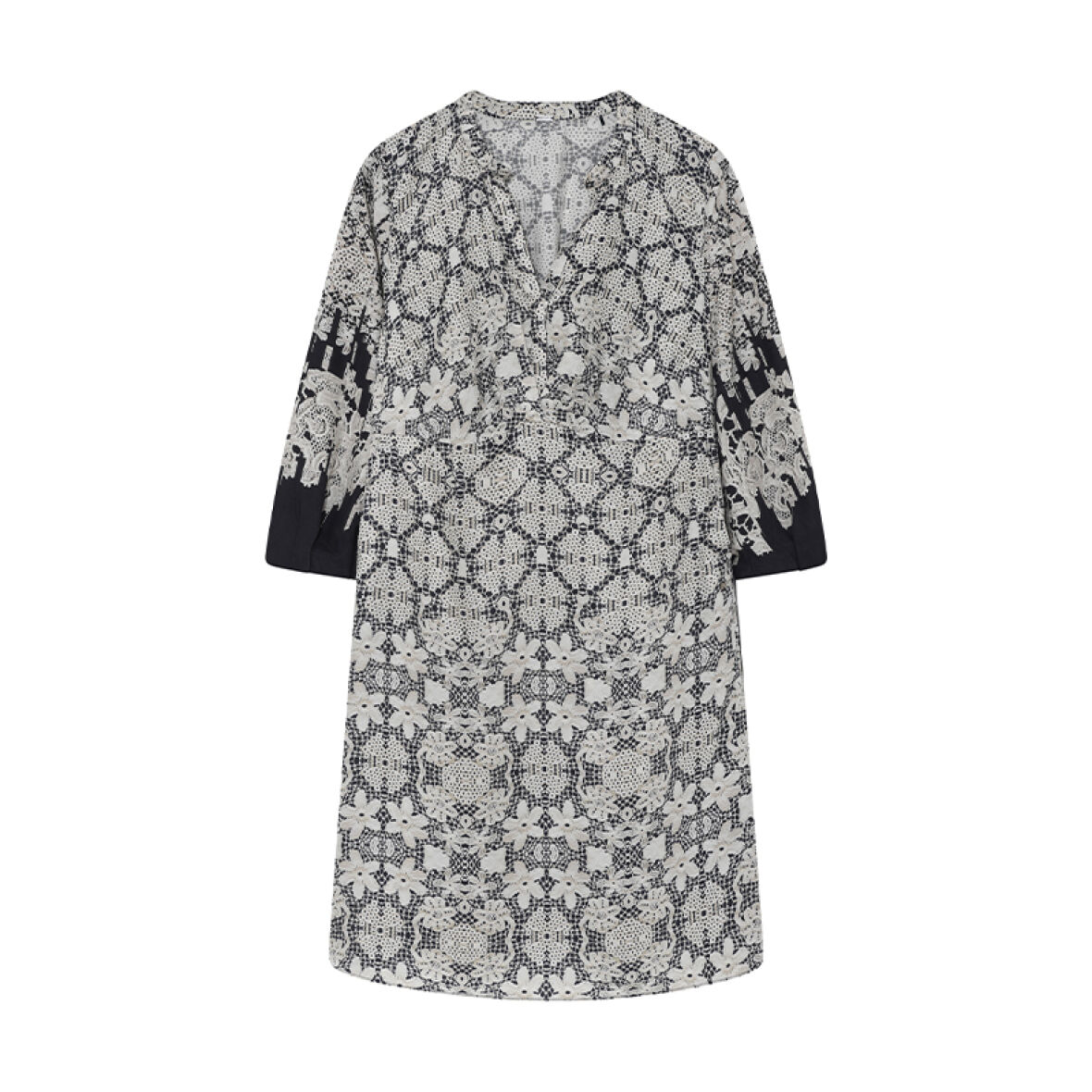 Denne smukke Bettie Gustav kjole har et elegant gråt og sort mønster med smukke blomsterdetaljer. Snittet ved brystet giver kjolen et flatterende og sofistikeret udtryk. Perfekt til både hverdag og festlige anledninger, hvor du ønsker at fremhæve din stil.
