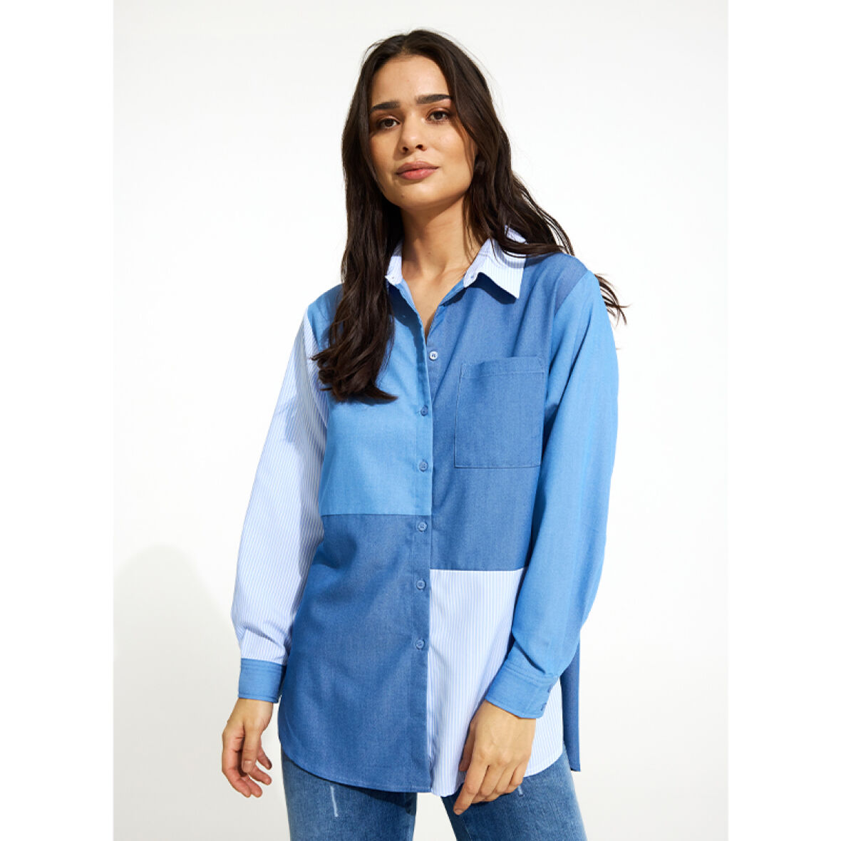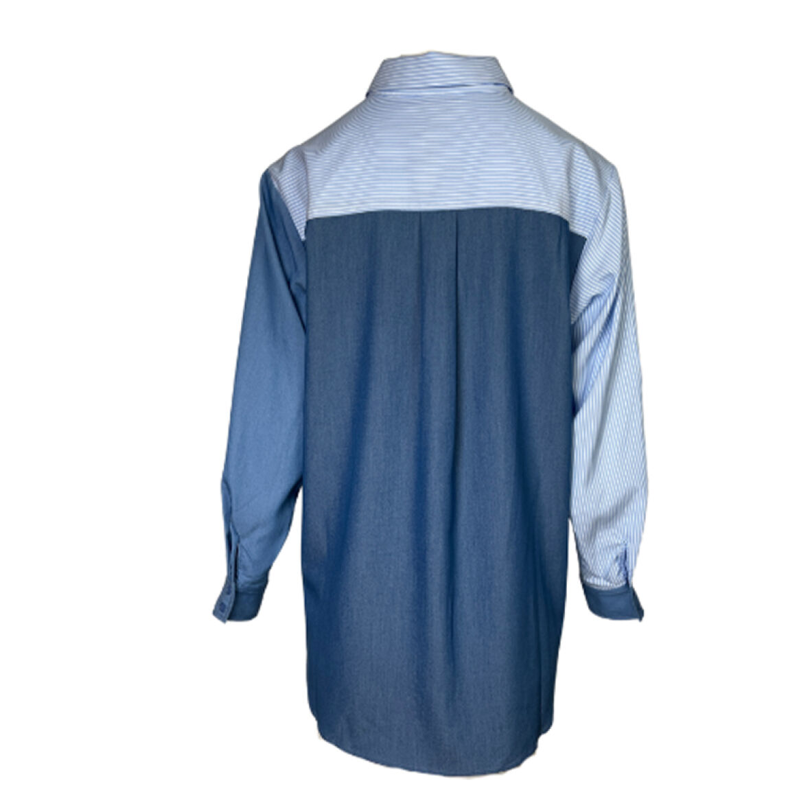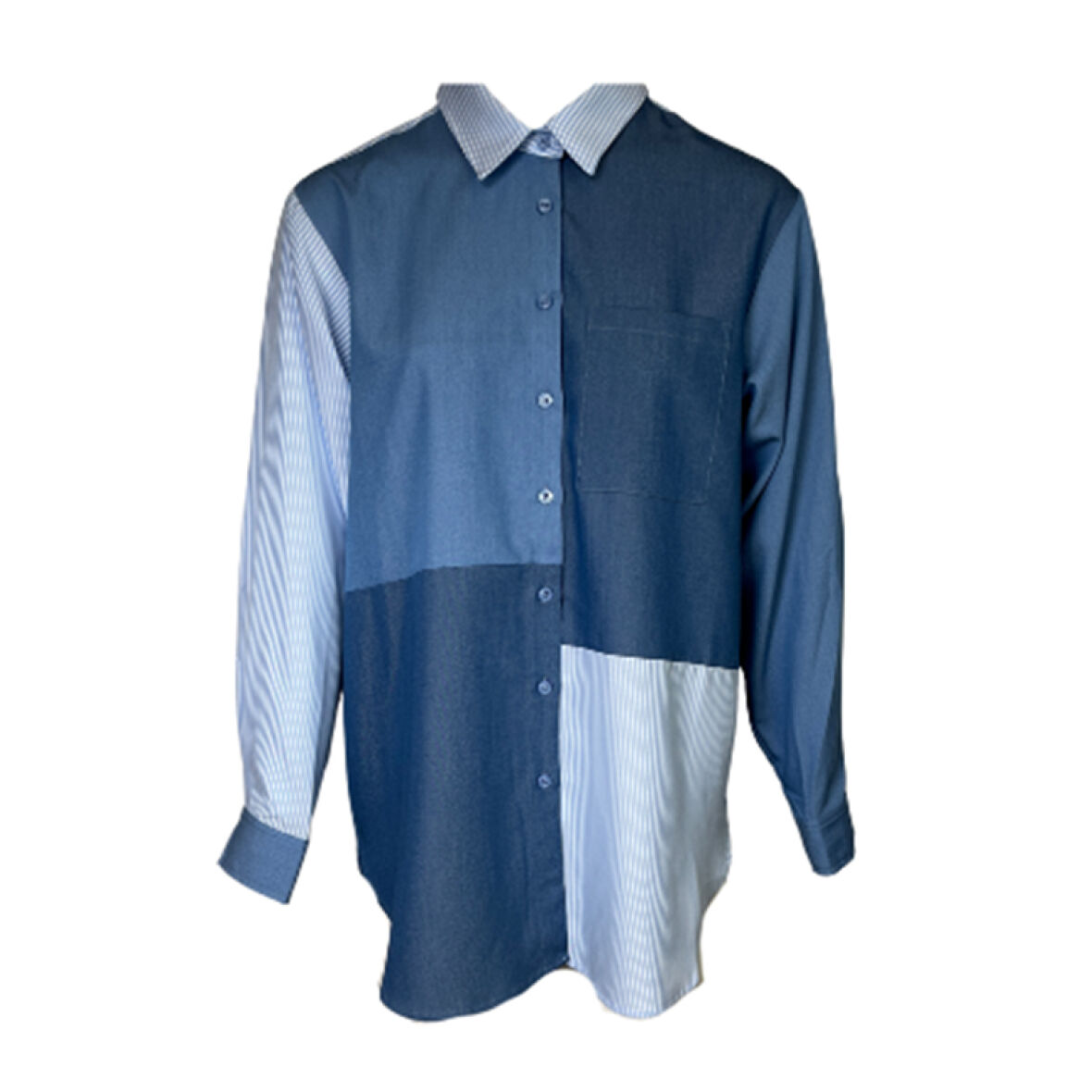 Skjorten er designet med et smukt patchworkmønster i skønne, farverige nuancer, der gør den både unik og iøjnefaldende.
