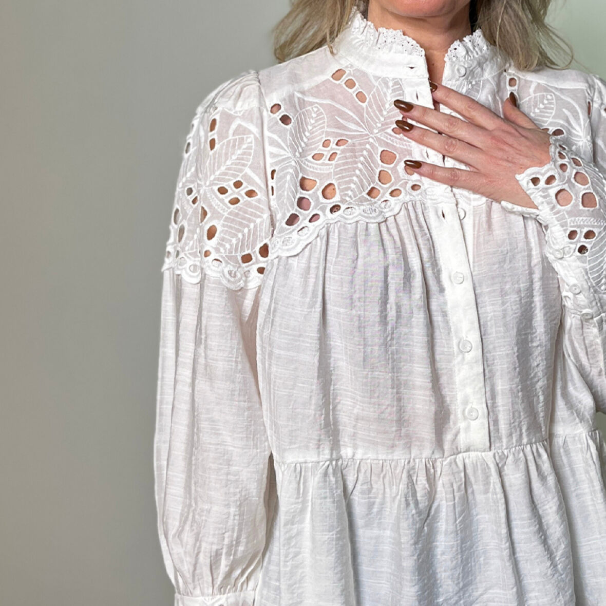 Blusen har et detaljeret design med broderede udskæringer på brystet og ærmerne. Den har en høj hals med elastisk kant.