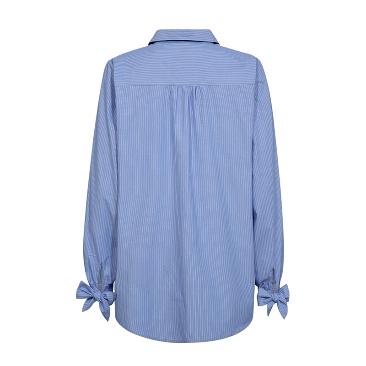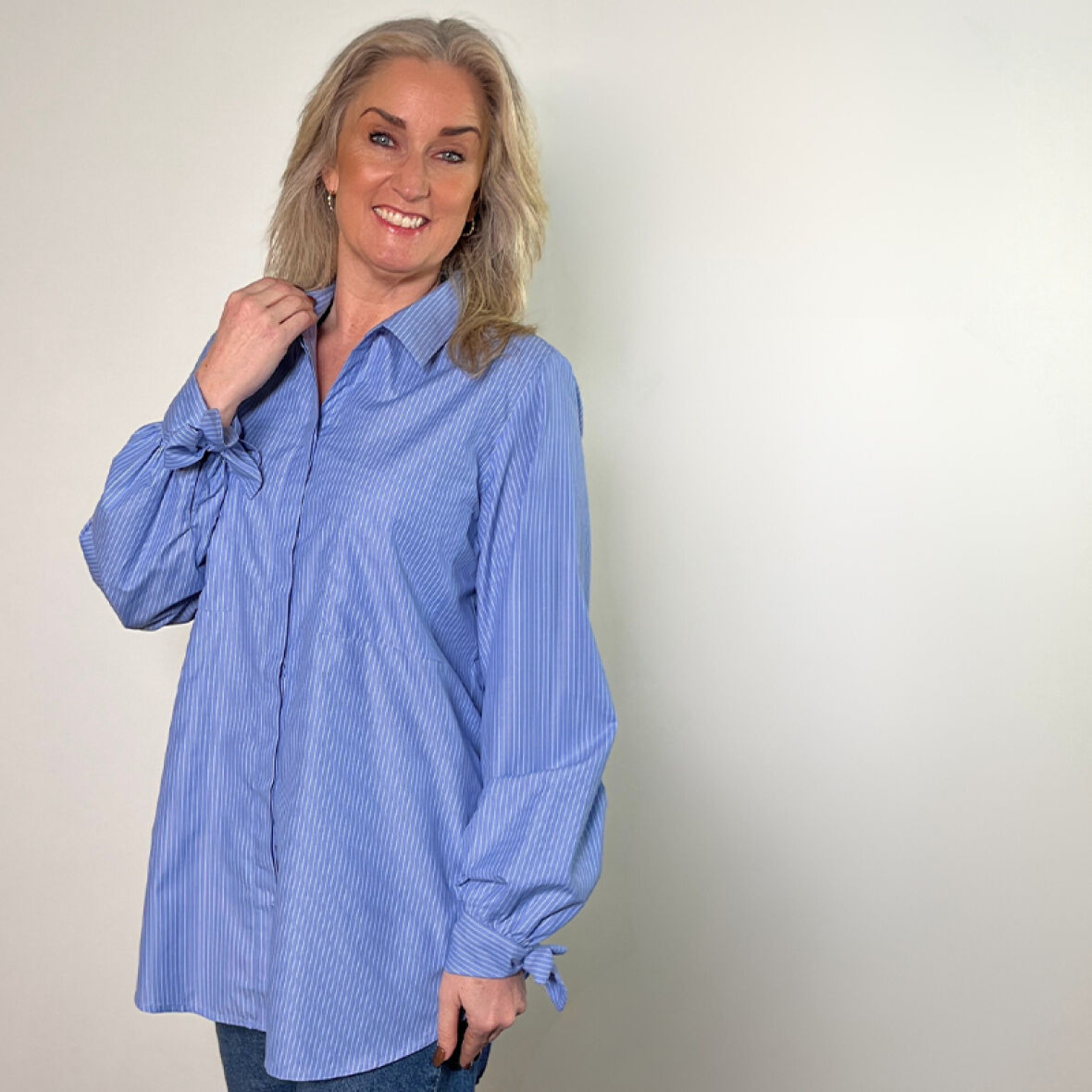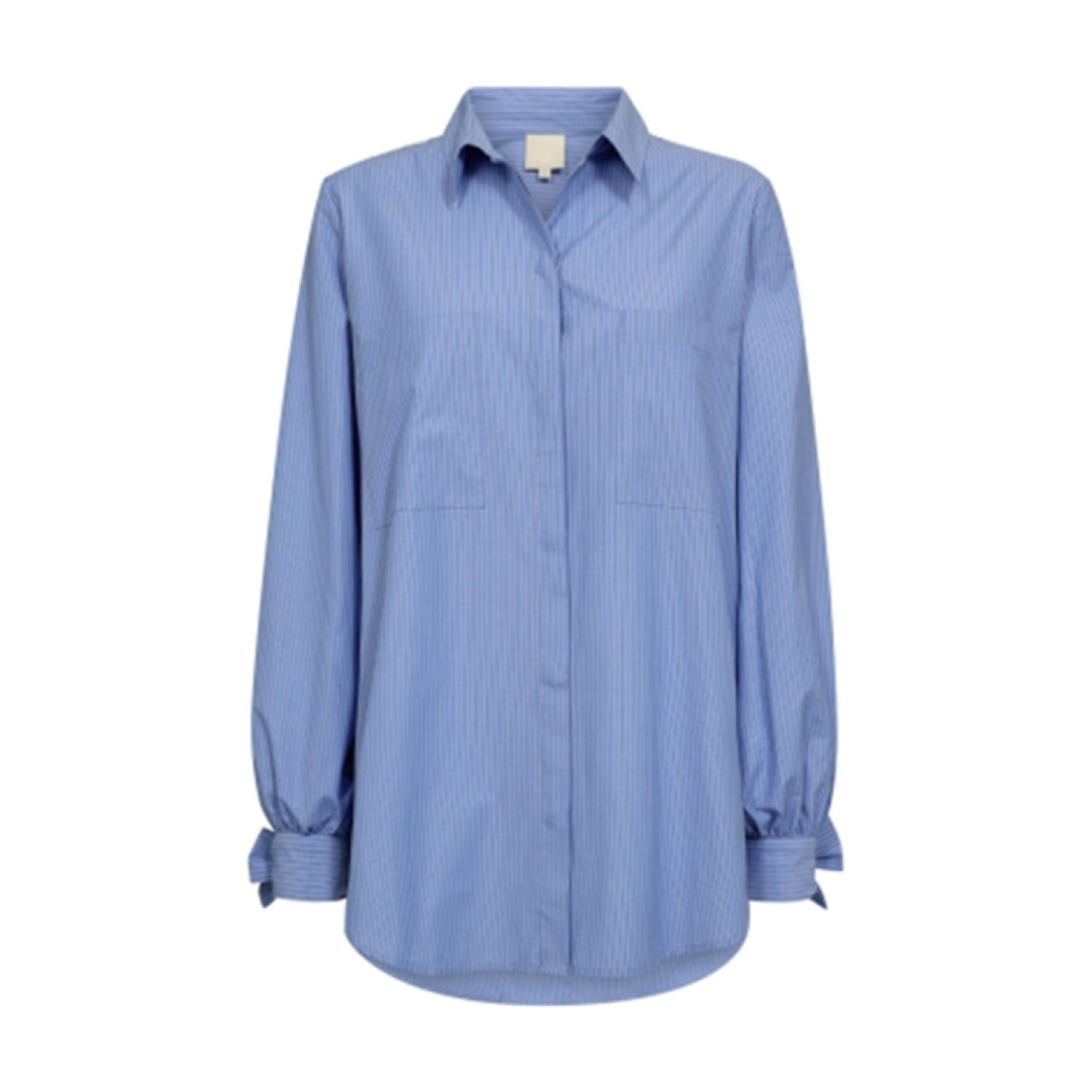 JosineGO Shirt er en elegant og løstsiddende skjortebluse med smukke, hvide lodrette striber. Blusen har en skjult knaplukning foran, der giver et stilrent udtryk. De lange ærmer afsluttes med brede manchetter, som er udstyret med lange bånd, der kan bindes til en dekorativ detalje omkring håndleddene. Perfekt til både hverdag og festlige anledninger.