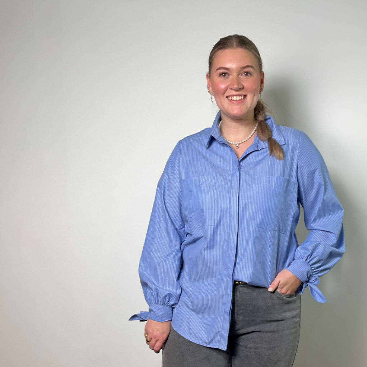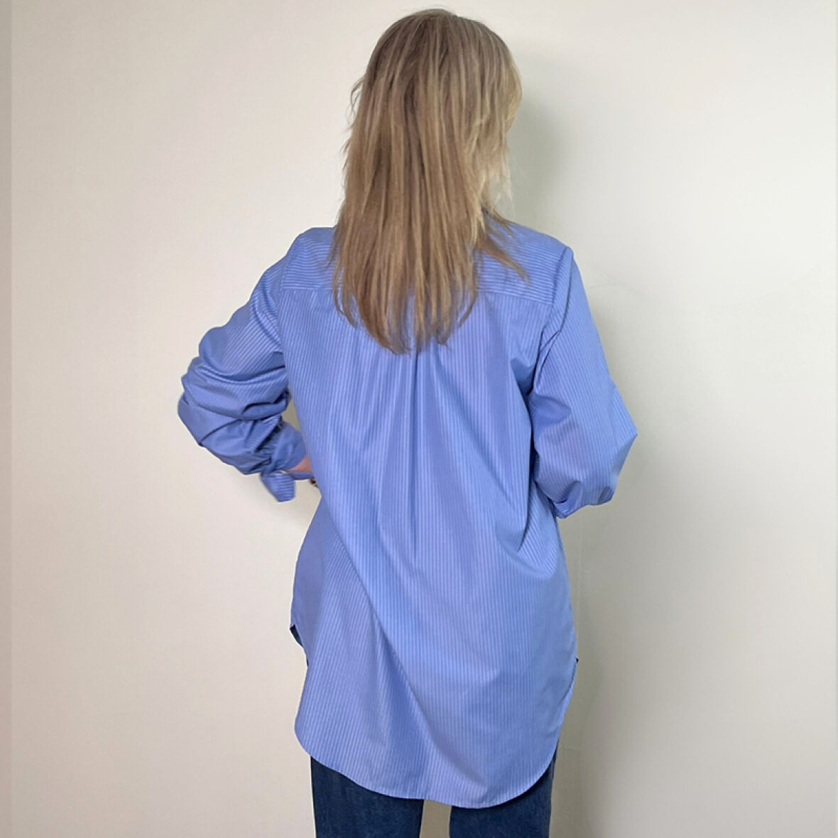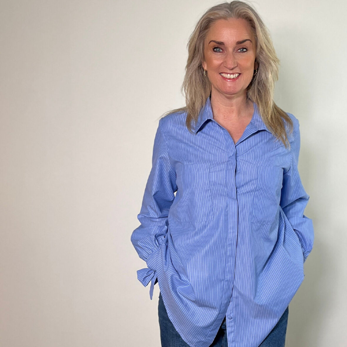 JosineGO Shirt er en elegant og løstsiddende skjortebluse med smukke, hvide lodrette striber. Blusen har en skjult knaplukning foran, der giver et stilrent udtryk. De lange ærmer afsluttes med brede manchetter, som er udstyret med lange bånd, der kan bindes til en dekorativ detalje omkring håndleddene. Perfekt til både hverdag og festlige anledninger.