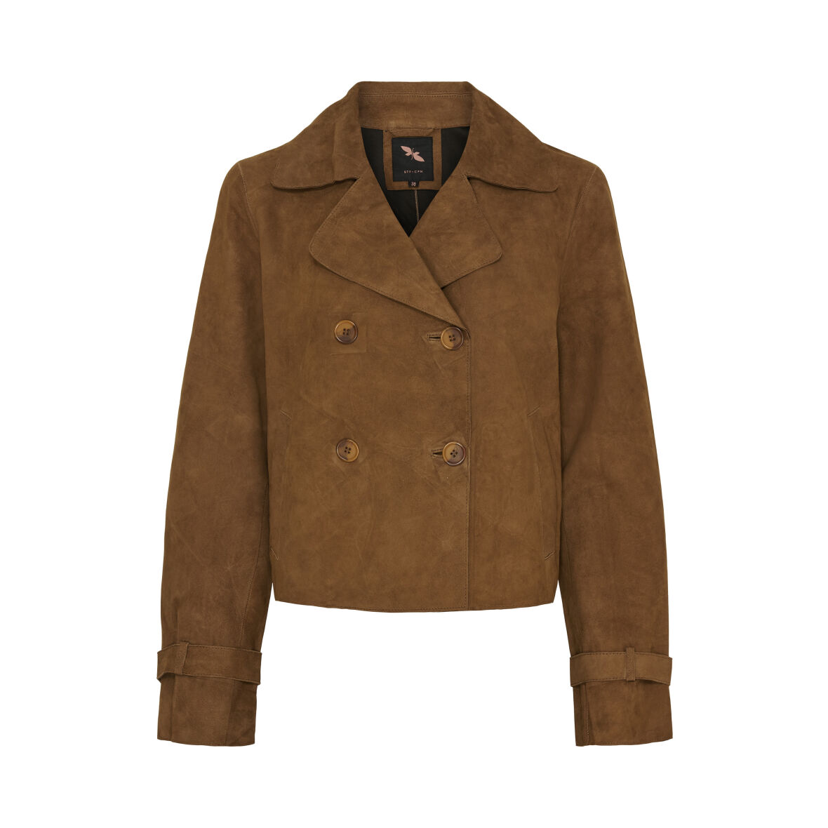 Opgrader din garderobe med denne smukke brune jakke, der kombinerer klassisk elegance med fine detaljer. Jakken har flotte knapper, en lomme i hver side og stilfulde detaljer omkring ærmerne, der giver et unikt og feminint touch. Perfekt til både hverdag og mere formelle anledninger – et must-have i enhver garderobe!