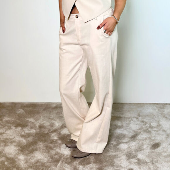 Buksen har elastik i ryggen, bæltestropper og lukkes med knap samt lynlås.