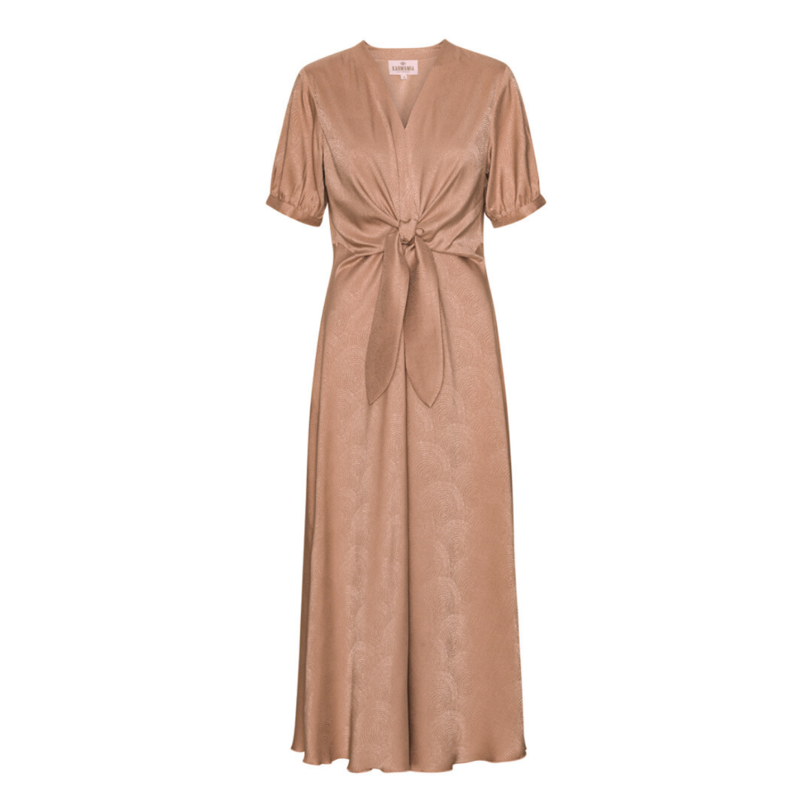 Formel maxikjole med V-udskæring og bindedetalje i taljen.