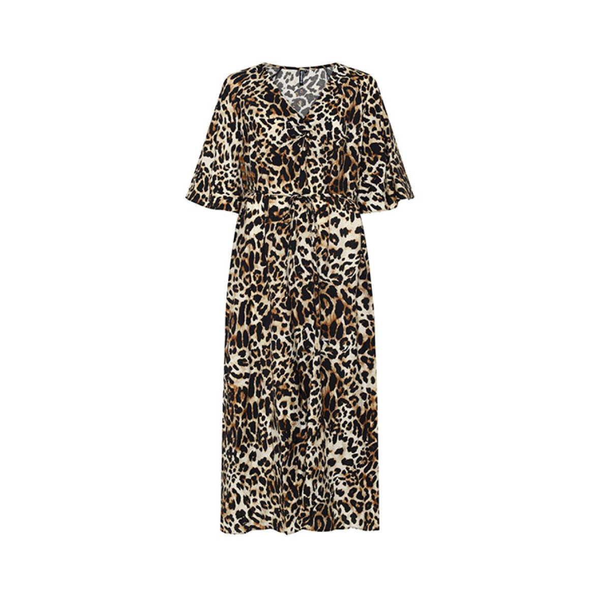 Denne smukke lange kjole fra Soulmate i modellen Elisabeth er designet med et moderne leopardprint i brune nuancer, der giver et sofistikeret og tidløst look. Kjolen har korte ærmer og en v-hals med en feminin rynke detalje ved brystet. Den lange pasform falder flot og flatterende langs kroppen, hvilket giver en elegant silhuet. Lavet i en dejlig viskoseblanding, der gør kjolen både behagelig og let at bære.