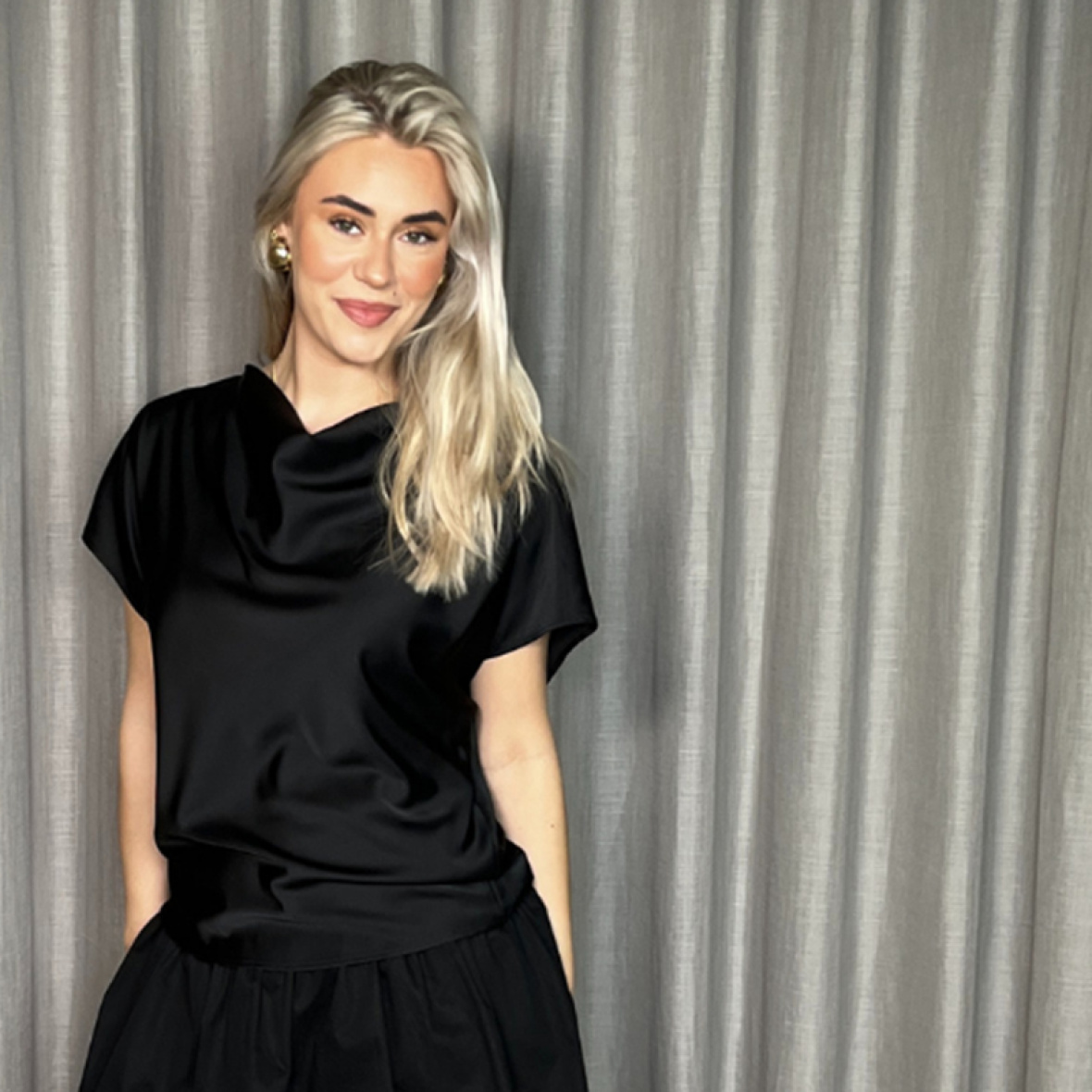 Den har et blødt draperet vandfaldsudskæring, der giver et feminint og sofistikeret udtryk.
