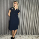 Kjolen har et V-udsnit og stolpeåbning med knapper i perlemor look.