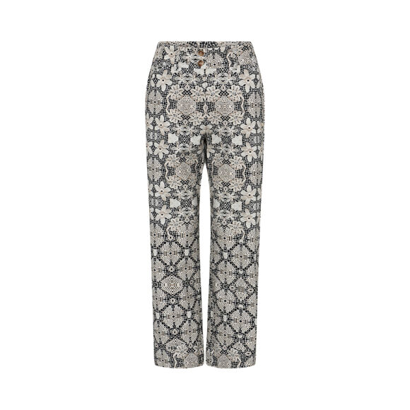 Bukserne har et klassisk tætsiddende snit med knap- og lynlåslukning, bæltestropper, saddleback og sidelommer samt slidser forneden.